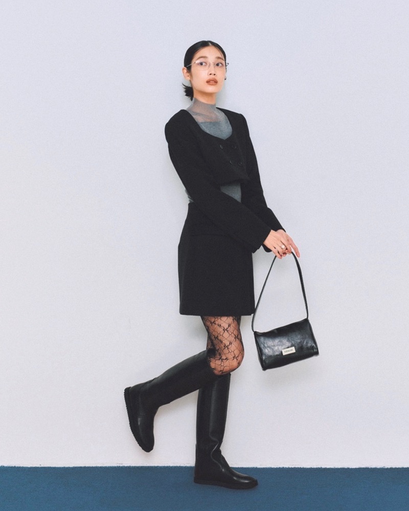 3月21日(土)、ドレッシーなセットアップには、グレーのシアータートルをインナーに仕込んで、ぐっとクールな印象に。レースタイツも肌見せをバランスよく整え、色っぽさとカッコよさを両立してくれます。ミニ丈にはロングブーツを合わせてモード感をプラス。そこに意外と効くのが「メガネ」です。メタル&リムレスの一本を足すだけで、コーデ全体が一気に都会的で洗練されたムードに。いつものモノトーンコーデも見違えるほど引き上がるから、一本持っておきたい小物です。