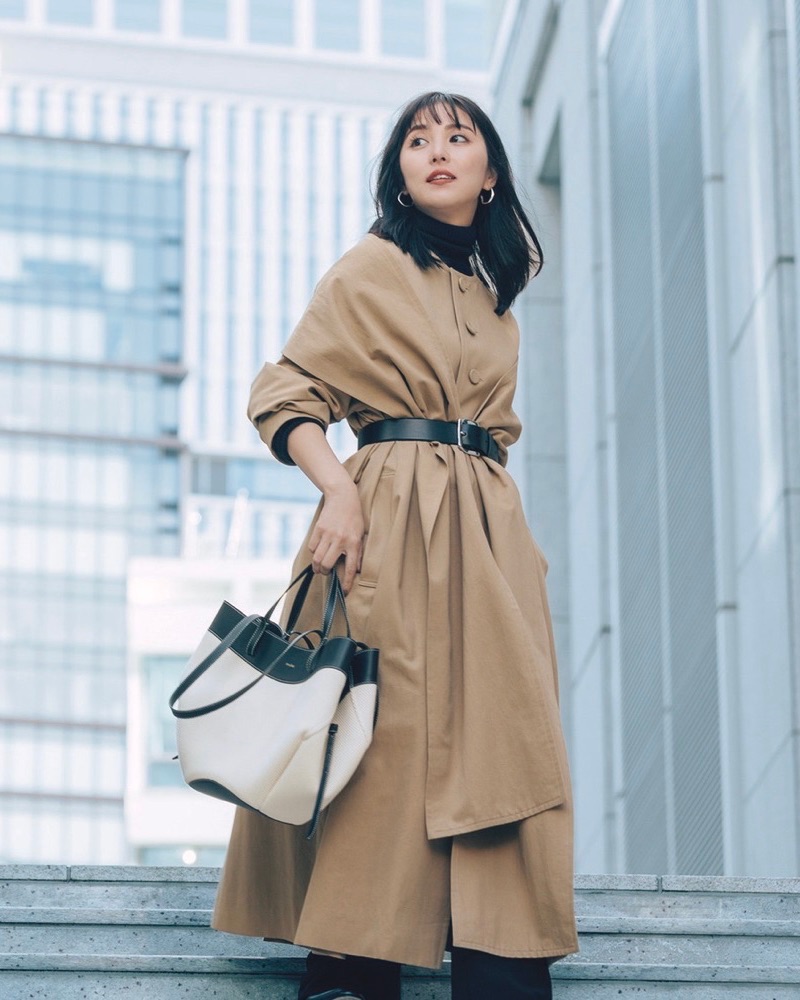 バッグ¥77,000(ポレーヌ)コート¥198,000(オブリオ)タートルニット¥29,700(スローン/ザ ショップ スローン新静岡セノバ店)パンツ¥28,930(イウエン マトフ/ユナイテッドアローズ 渋谷スクランブルスクエア店)ピアス¥28,600(ブランイリス/ブランイリス トーキョー)ベルト¥41,800(J&M デヴィッドソン/J&M デヴィッドソン カスタマーセンター)