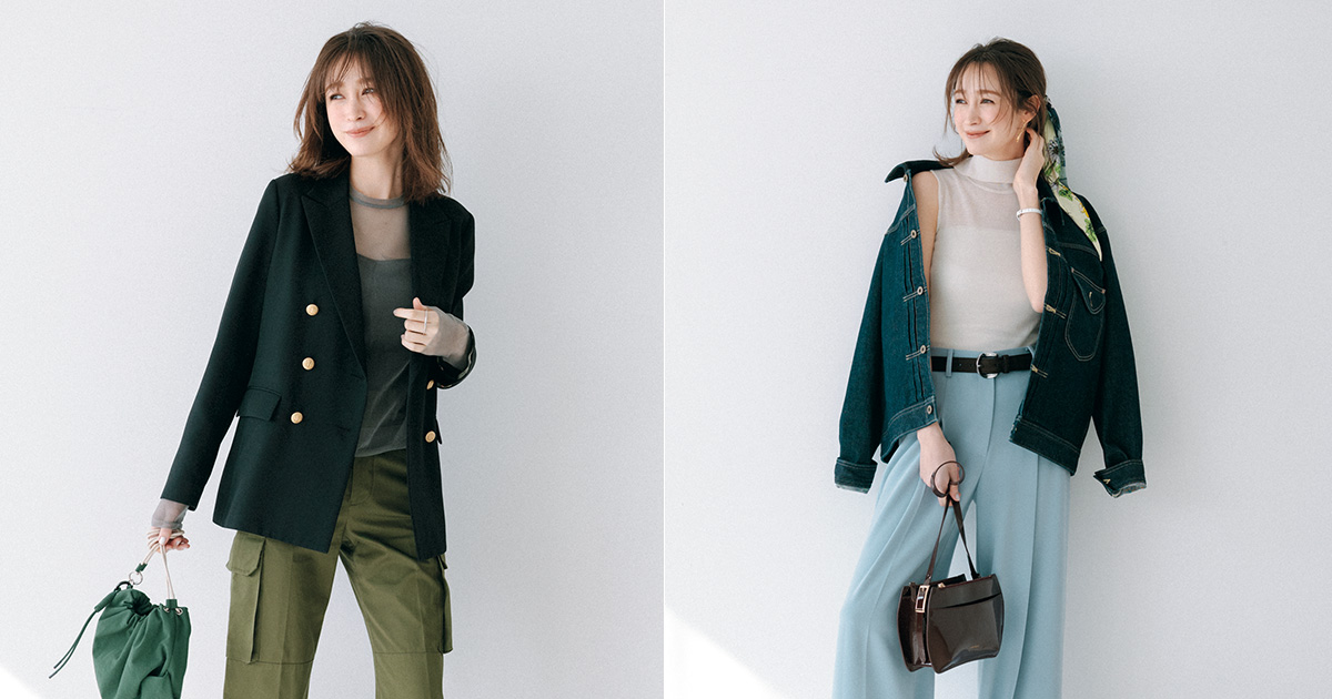 キレイ色のシアーニットも充実の今シーズン。軽やかに色を纏えるから、ベーシックカラー派も挑戦しやすい。やわらかなトーンで揃えると優しげで親しみやすいムードに着地。