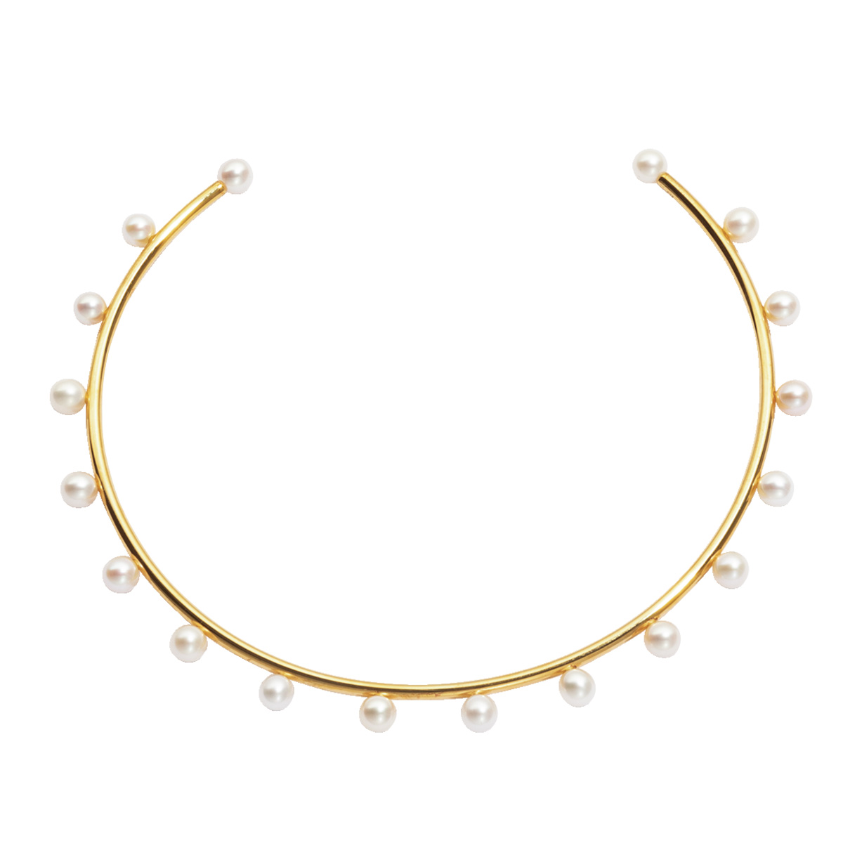 オフィスでも浮かないパールチョーカーで、ベーシックな装いに大人可愛いアクセントと洒落感をひと盛り。衿の詰まったトップスとも相性抜群です。チョーカー¥132,000(ビジュードエム/ビジュードエム六本木ヒルズ)