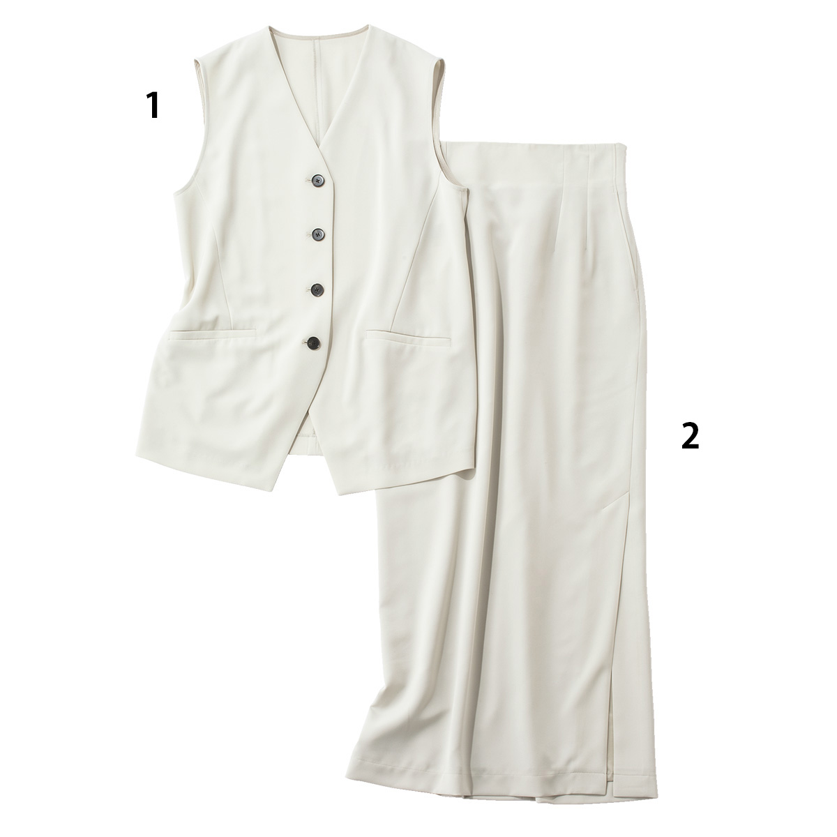 ジレ×スカートの組合せならかっこよさと女らしさを両立。マシンウォッシャブルでシワになりにくいから、デイリーに着やすい。ジレ¥18,700スカート¥18,700(ともにアンクレイヴ/オンワード樫山 お客様相談室)