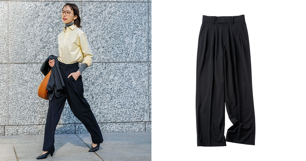 深めのタックを施したゆとりのあるシルエットが洗練された着こなしを後押し。シンプルなワンツーコーデでも上品に決まる、毎日のオフィカジを支える一着。パンツ¥28,600(シンゾーン/シンゾーン ルミネ有楽町店)