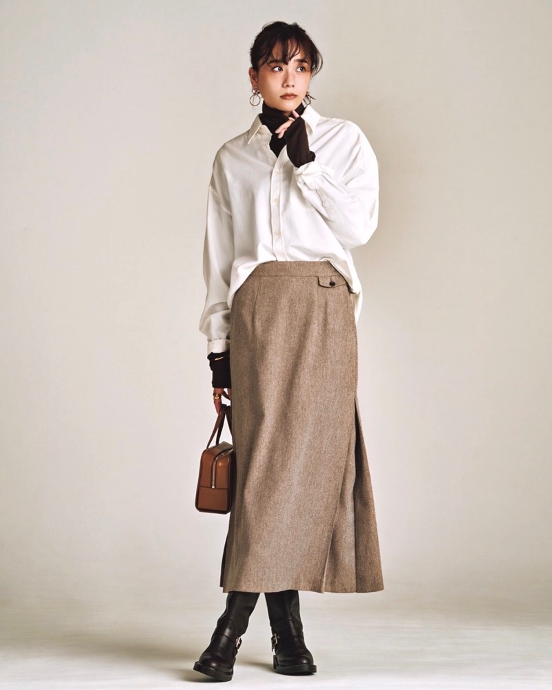 タートルカットソー¥7,150(ステートオブマインド/ゲストリスト)シャツ¥31,900(ヤヌーク/カイタックインターナショナル)スカート¥13,090(ホワイト/スーツスクエア TOKYO GINZA店)バッグ¥38,900(トゥティエ)ブーツ¥34,650(ダイアナ/ダイアナ 銀座本店)イヤリング¥6,820(イットアトリエ/フォーティーン ショールーム)バングル¥34,980リング(2個セット)¥39,160(ともにソコ/ZUTTOHOLIC)