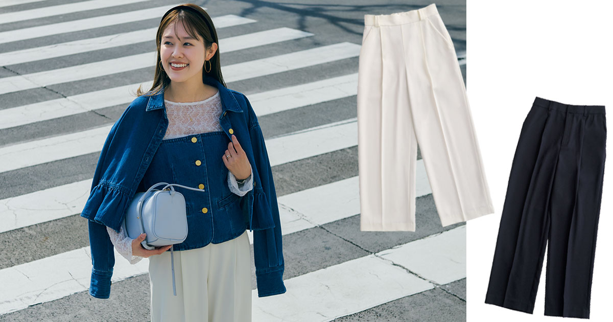 トップスにベーシック色を合わせることが多いのもあって、コーデが一気に華やぐ白スラックスが大好き。デニムをボトムスではなくトップスで取り入れたいこの春、ビスチェとフリルジャケットのセットも白スラックスなら清潔感をキープしつつ、こなれたムードで着こなせます。