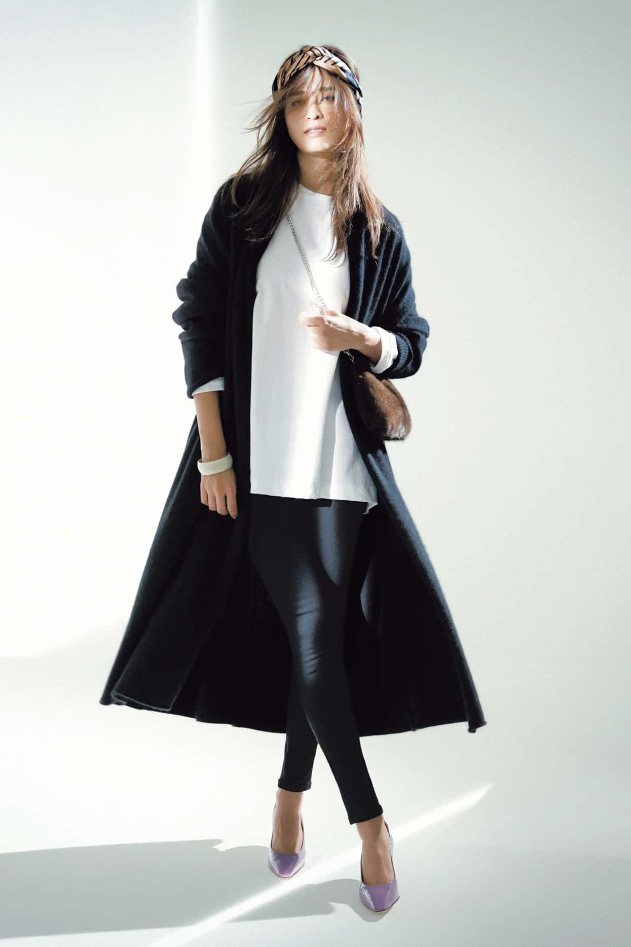 冬に映えるクリーンな洗練ホワイトで旬のロングシルエットにトライVカットパンプスがさらにクールに仕上げてくれる。