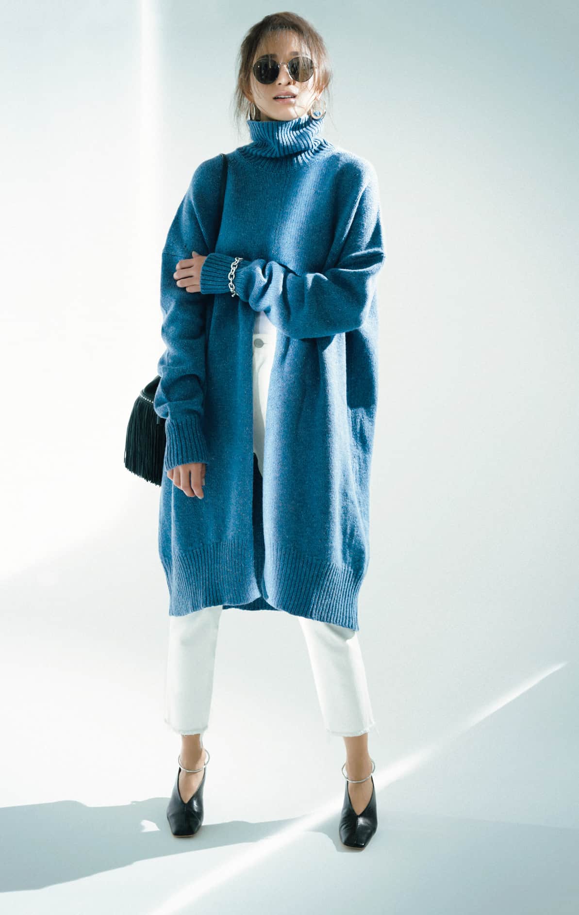 ニット¥78,000(マディソンブルー)デニムパンツ「セルビッチホワイトヘリテージデニム」¥17,000(スタニングルアー/スタニングルアー 青山店)パンプス¥87,000(ジル サンダー/インターナショナルギャラリー ビームス)タンクトップ¥7,200(エイトン/エイトン青山)バッグ¥132,000(J&M デヴィッドソン/J&M デヴィッドソン 青山店)サングラス¥35,000(モスコット/モスコット トウキョウ)ピアス¥5,728ブレスレット¥14,728(ともにアビステ)