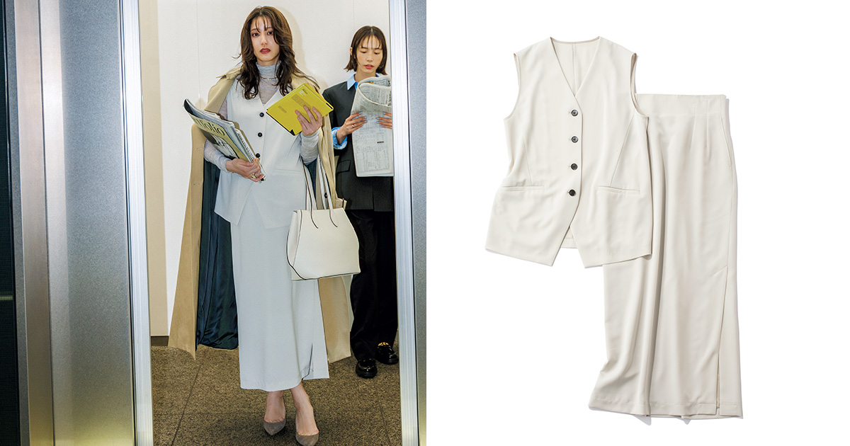ジレ×スカートの組合せならかっこよさと女らしさを両立。マシンウォッシャブルでシワになりにくいから、デイリーに着やすい。ジレ¥18,700スカート¥18,700(ともにアンクレイヴ/オンワード樫山 お客様相談室)