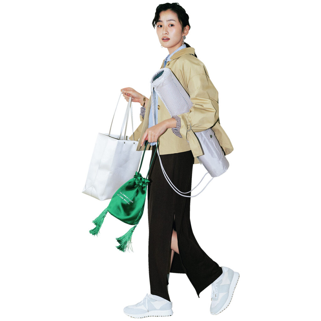 清潔感があり、スニーカーでもラフに見えにくい白スニーカーは、大人の着こなしになじみやすい一足。ショートトレンチ×ロングスカートの端正なスタイルも、足元に白を効かせることで印象がぐっと柔らかくなります。きちんと感も動きやすさも両立できるから、退勤後にヨガや習い事へ向かう日にもぴったり。