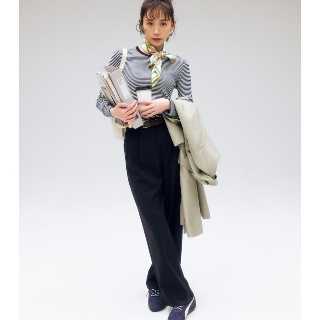 ボーダートップスとネイビーパンツのトラッドな着こなしは、足元もネイビーでそろえることで全体がグッと落ち着いた雰囲気にまとまります。スニーカーでもカジュアルに寄りすぎず、大人っぽく履けるのがネイビーの魅力。スカーフを効かせて、シンプルなワンツーコーデを品よく仕上げて。