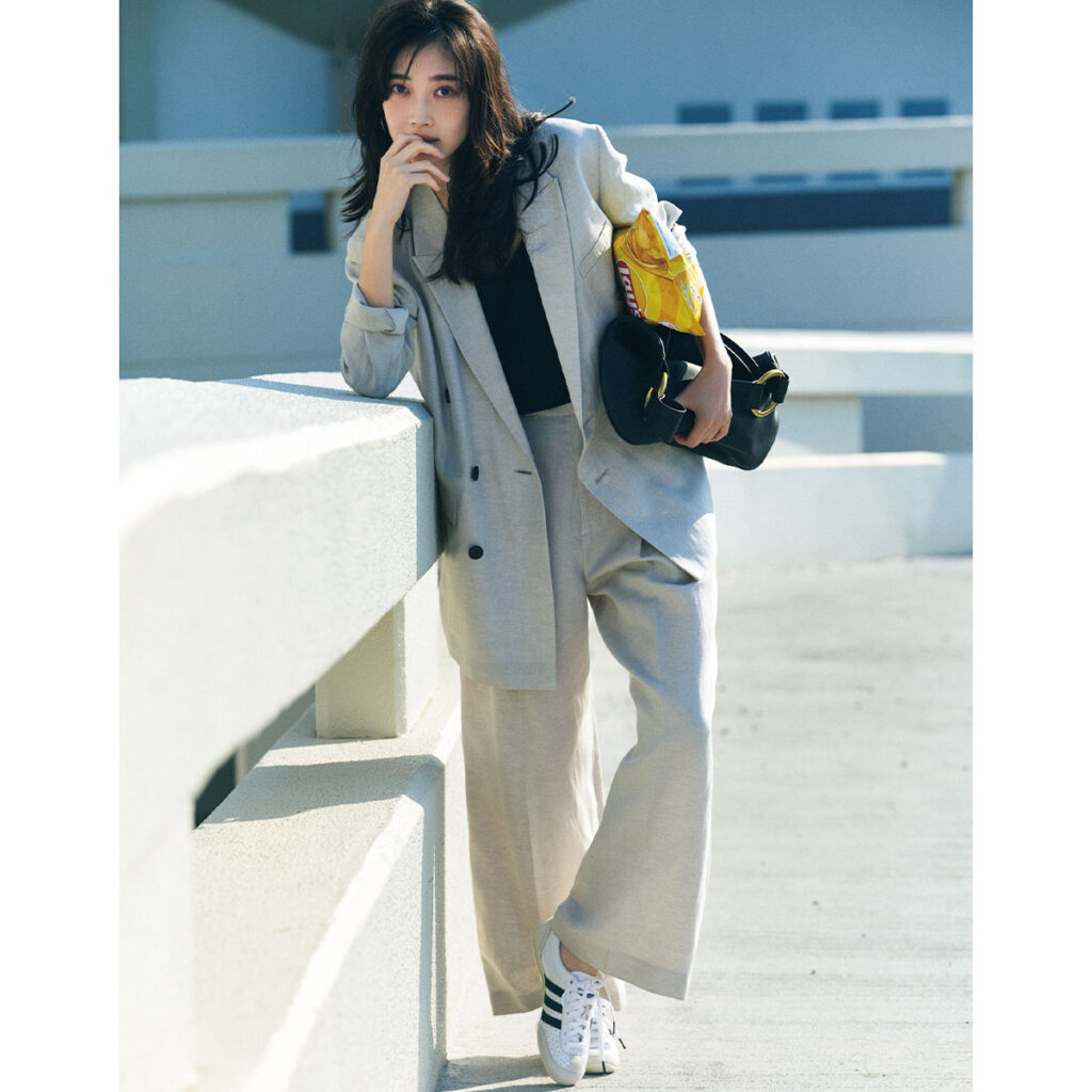 カチッとしたジャケパンには薄底スニーカーが新鮮