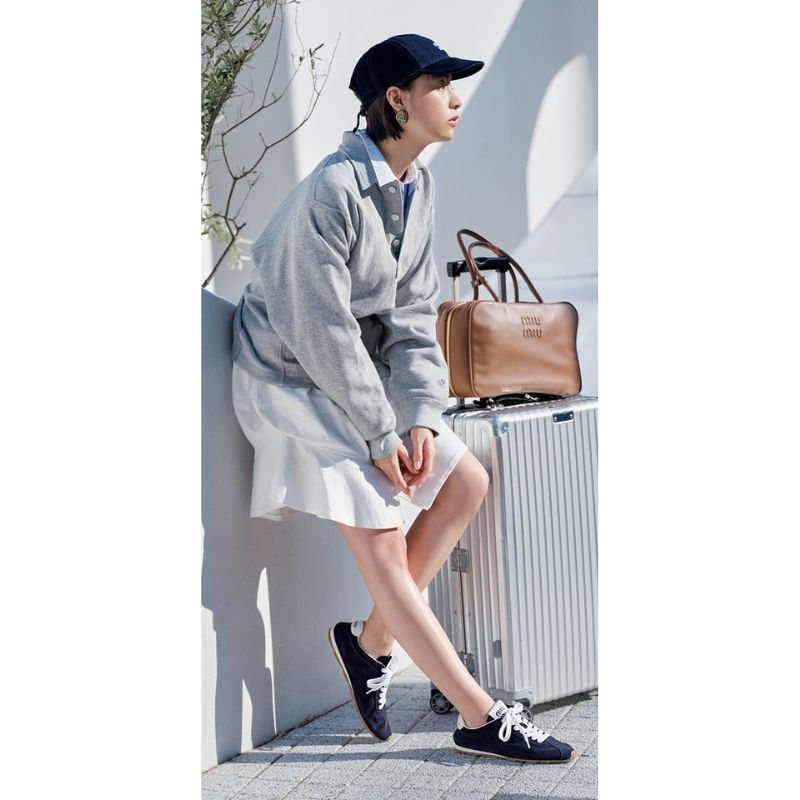 旅行シーンでは、ネイビースウェードに白を効かせた爽やかな一足を味方に。たくさん歩く日も頼れて、写真に写ってもカジュアルに見えすぎないのがうれしいポイントです。スウェットで肩の力を抜きつつ、シャツや白スカートで好印象をしっかりキープ。