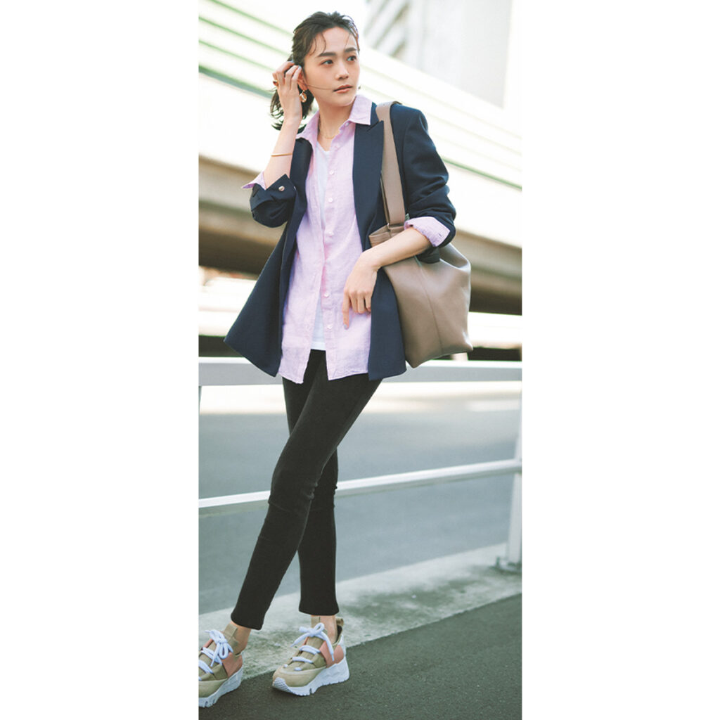 ネイビージャケットの洗練された着こなしに、ピンクシャツで春らしいムードをプラス。足元はベージュ×白の配色スニーカーで外して、キレイめをベースにしながら今どきのバランスに。細見パンツですっきりまとめることで、スニーカーの存在感がほどよいアクセントとして効いてくれます。