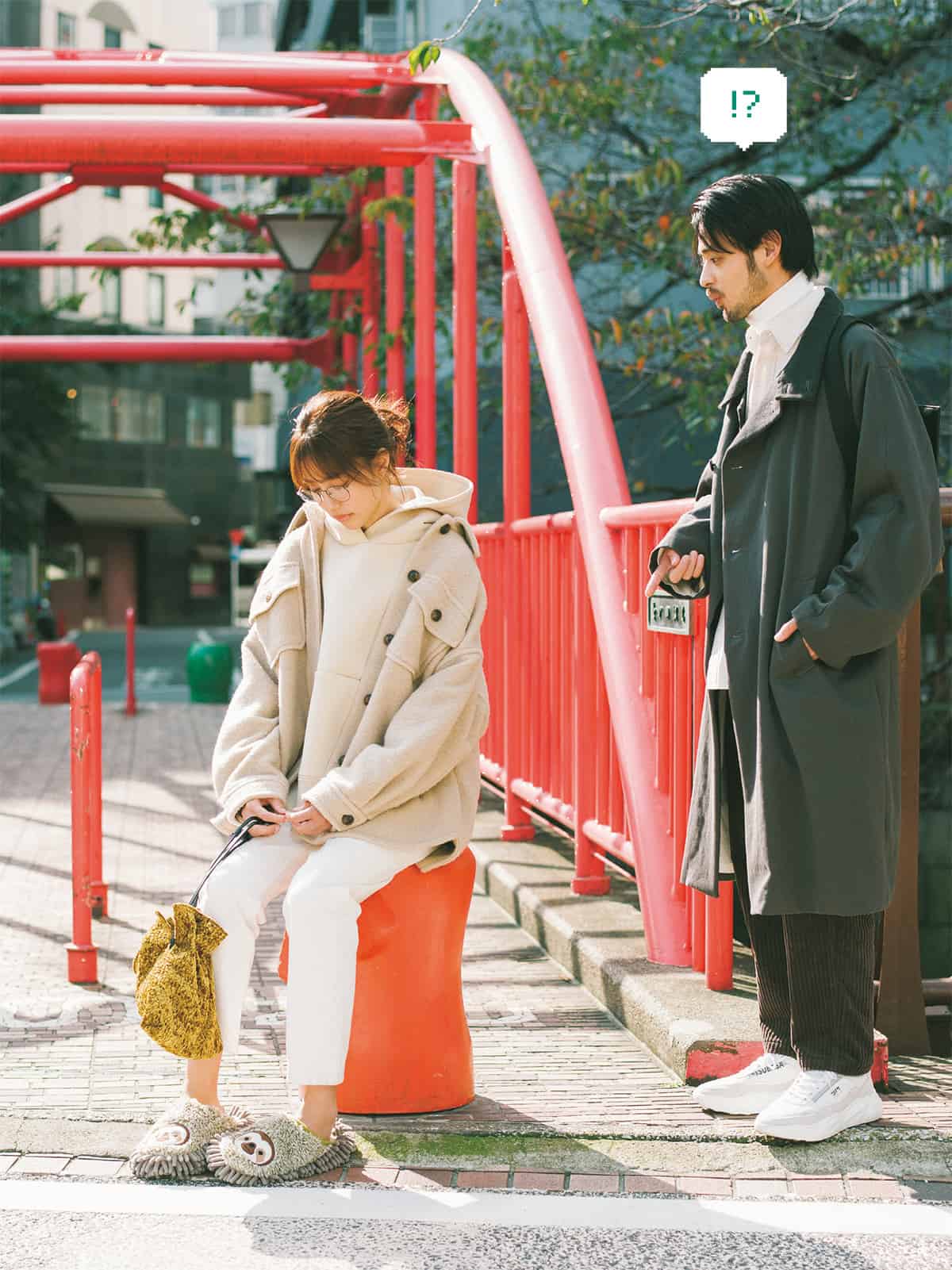 ひきこもってるのはマズイと外に出てみたものの、歩くのすら辛い。「またひとりごと声に出てるし、靴がスリッパのままですよ…ていうか何それ」「え、ナマケモノ。ていうか誰」。 バッグ¥26,000(アーロン/タトラス&ストラダ エスト青山店)メガネ¥41,000(オリバーピープルズ/ルックスオティカジャパン カスタマーサービス)スリッパ(スタイリスト私物)