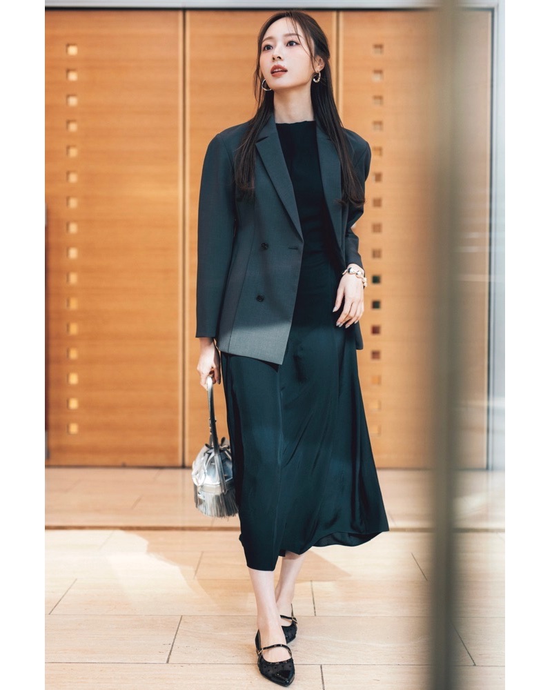 ワンピース¥57,200(セオリー/リンク・セオリー・ジャパン)ジャケット¥88,000(コラム/エストネーション)バッグ¥154,000(J&M DAVIDSON/J&M デヴィッドソン カスタマーセンター)靴¥36,300(ファビオ ルスコーニ/伊勢丹新宿本店 本館2階 婦人靴)ピアス¥25,850(ココシュニック オンキッチュ/ココシュニック)ブレスレット¥221,320(バルブス/ZUTTOHOLIC)