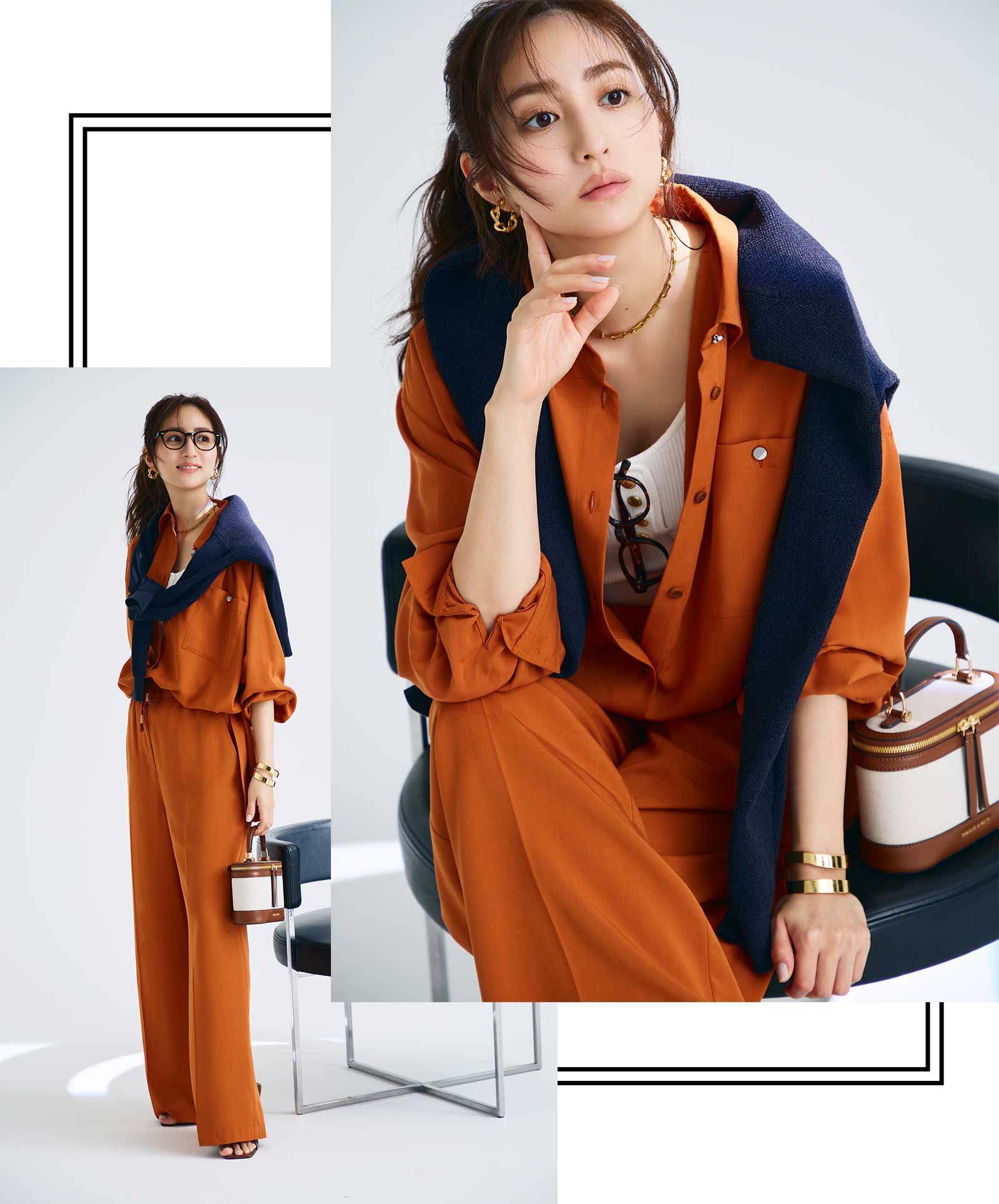 シャツ×パンツのセットアップは、とろみ素材でゆるっと着るのが今っぽい。肌馴染みのいいテラコッタオレンジなら、旅先らしいムードも高まります。単品でも着回しやすく、デイリーにも旅でも使い勝手バツグン。シャツ¥50,600タンクトップ¥28,600肩にかけたカーディガン¥50,600パンツ¥46,200(すべてタトラス/タトラス カスタマーセンター)バッグ¥10,900サンダル¥8,900(ともにCHARLES & KEITH/CHARLES & KEITH JAPAN)メガネ¥46,200(アイヴァン/アイヴァン 東京ギャラリー)イヤリング¥16,200ネックレス¥9,900バングル¥4,400(すべてアビステ)