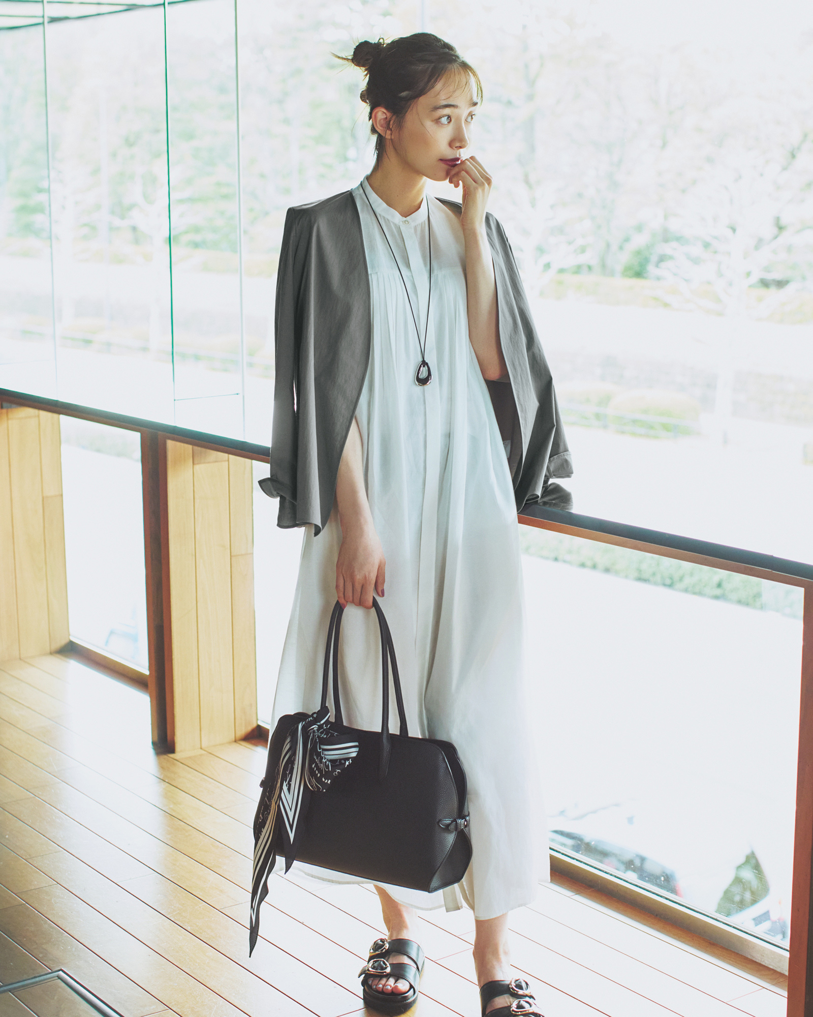 ジャケット※着回し ワンピース¥36,960 ネックレス¥8,910 バッグ¥22,000 バッグに巻いたスカーフ¥9,900 サンダル¥16,940(すべてICB/オンワード樫山 お客様相談室)