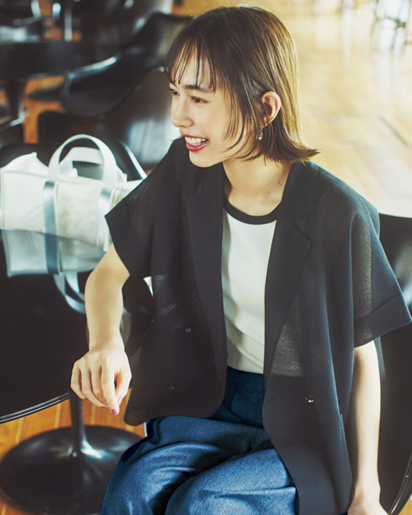 身幅にゆとりのあるリラクシーなフォルムでありつつ、テーラード&ダブルボタンでスマートさも兼備。通勤服の定番=黒ジャケットこそ、今のムードを投影して、社会人生活にもオシャレにも慣れた〝5年目の余裕〟を。