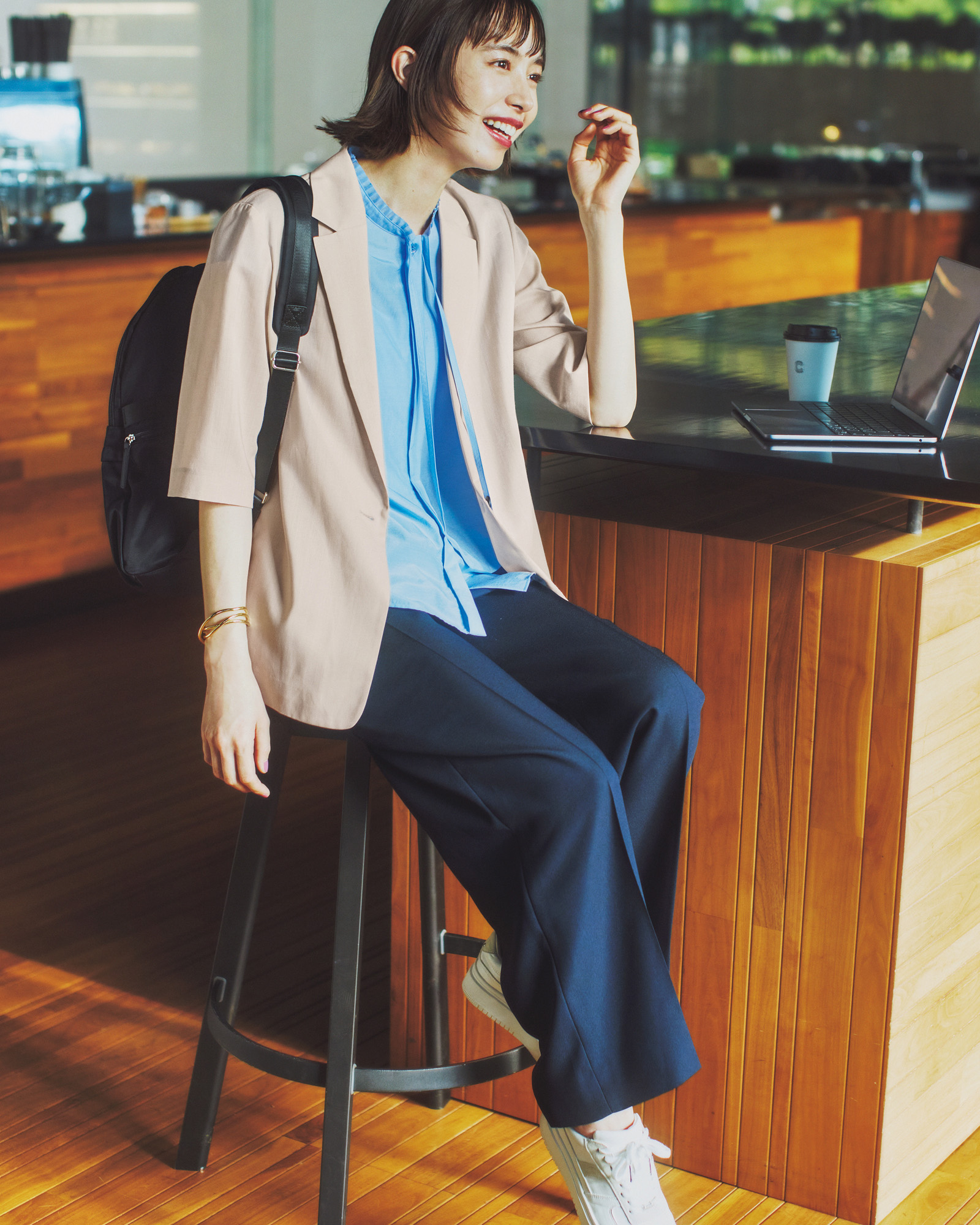 ジャケット¥39,930 ブラウス¥20,900 パンツ¥20,900 バングル¥13,970 リュック¥17,930 スニーカー¥19,910(すべてICB/オンワード樫山 お客様相談室)