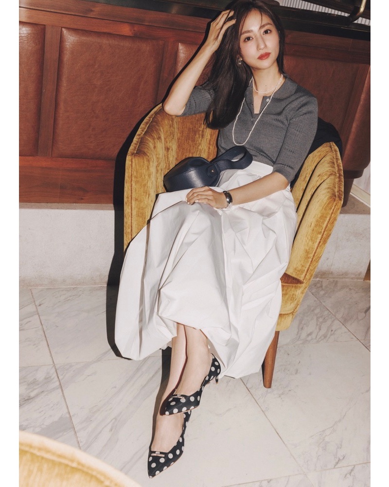4月16日(木)、グレーのポロニットをきれいめに着こなすなら、主役級のパンプスで。ポインテッドトゥを選べば、足元にさりげないよそ行き感が加わります。白のスカートで全体をモノトーンにまとめつつ、小物はレザーやパールで上品さをプラスして。シンプルなトップスでも、足元で華やぎを足すだけでバランスの取れた大人コーデになります。