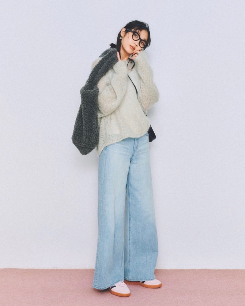 4月19日(日)、淡色のざっくりニットに淡いカラーのワイドデニムで、やさしいトーンのカジュアルコーデ。一見ぼやけがちな配色も、メガネをプラスするだけでぐっと引き締まって見えます。選ぶなら黒に見えて実はネイビーのフレーム。黒よりも肌なじみがよく、淡色コーデとも自然にマッチするのがポイントです。強すぎない締め色として機能し、さりげない抜け感が生まれます。