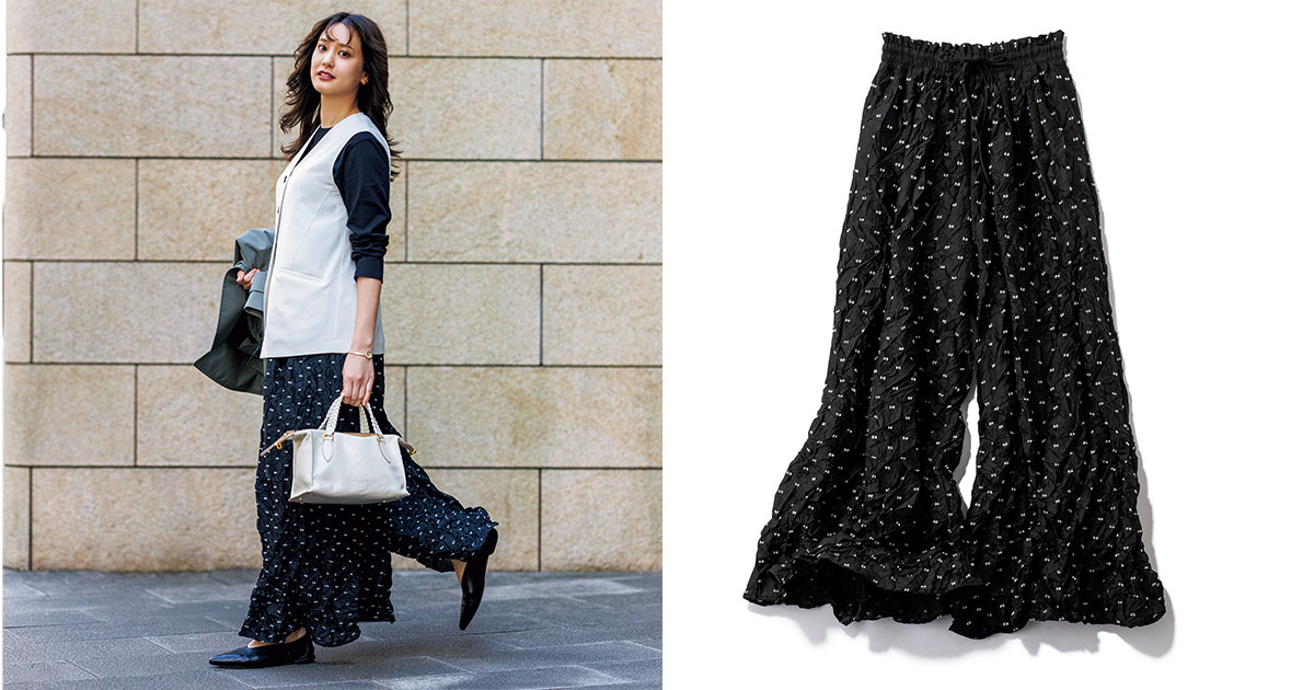 「なりたい自分」を軸にワードローブのベースを整えるだけで、コーデ迷子とはもうおさらば。今回は、シンプル派におすすめの「Cygneのジャガードワイドパンツ」を主役に、艶っぽく仕上がるお仕事コーデを2パターンご紹介します!