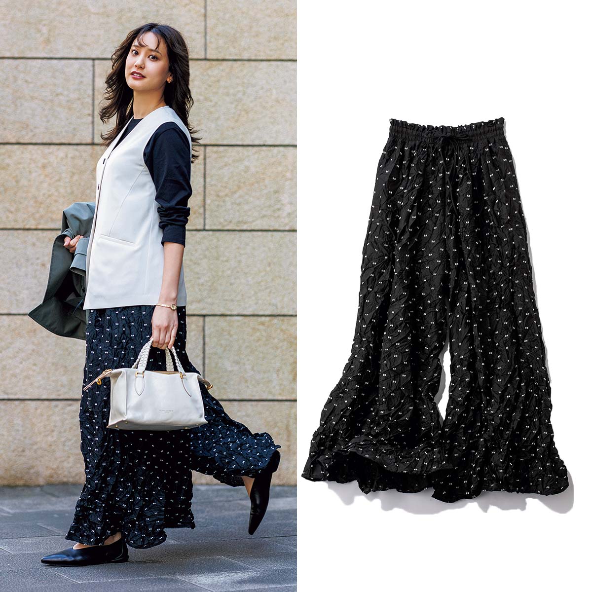 女子会は、写真を撮る前提で顔周りが明るくなるボウタイブラウスがマスト。デザインパンツを投入すれば、仕事終わりでもオシャレなお店になじむ華やかな装いに。手に持ったコート¥27,000(PLST)カチューシャ¥6,050(IRIS 47/フーブス)イヤリング¥33,000(ケンゴ クマ プラス マユ/ヴァンドームヤマダ)リング¥39,600(ブランイリス/ブランイリス トーキョー)