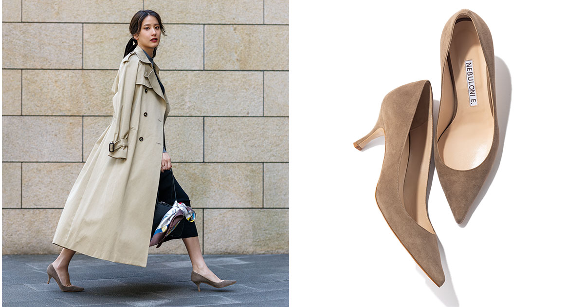 素敵な先輩が履いてる率ナンバーワンのヌーディカラーのパンプスで気分も女度もアップ。ベーシックだからこそ、デザイン性だけでなく歩きやすさも兼ねそろえた名品に投資して。パンプス¥64,900〈ヒール6.5cm〉(ネブローニ)