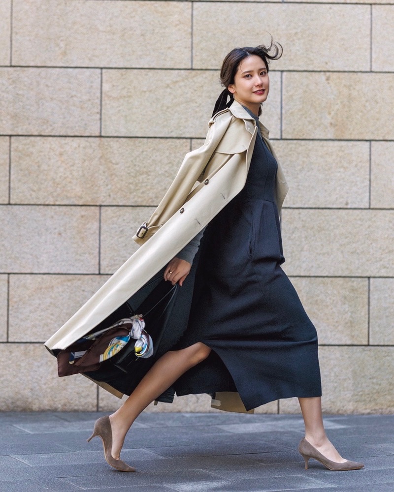 ワンピース¥18,700(ローブ ブラン)ニット¥13,200(カデュネ/カデュネ プレスルーム)コート¥99,000(ウィークエンド)パンプス¥64,900〈ヒール6.5㎝〉(ネブローニ)イヤリング¥37,400チャーム¥17,600リング¥68,200(すべてアガット)シュシュ¥58,300(アレクサンドル ドゥ パリ/アレクサンドル ドゥ パリ GINZA SIX店)バッグ¥82,500(メゾン カナウ×マルティニーク/マルティニーク ルミネ横浜)スカーフ¥27,500(アトリエトゥモローランド/トゥモローランド)