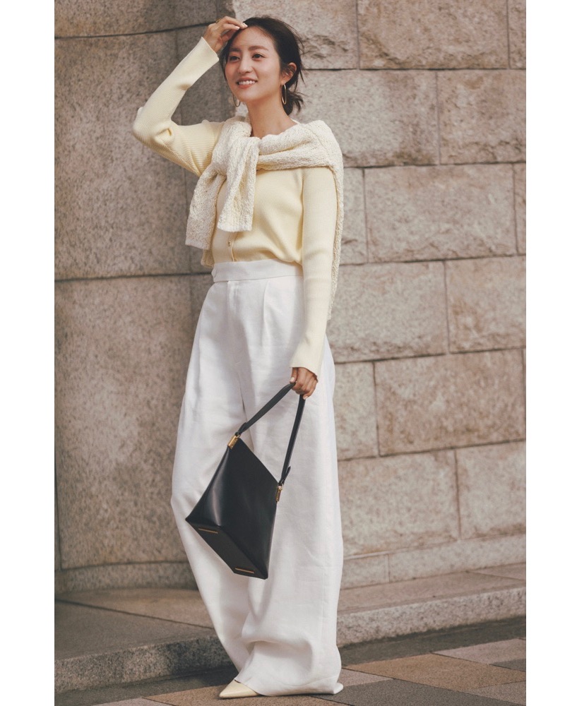 カーディガン¥16,500(Stola.)肩にかけたニット¥23,980(ユナイテッドアローズ/ユナイテッドアローズ 渋谷スクランブルスクエア店)パンツ[4月発売予定]¥49,500(ルル ウィルビー/アルアバイル)バッグ¥82,500〈マエストソ〉靴¥59,400〈ペリーコ〉(ともにアマン)ピアス¥42,900(マリハ)