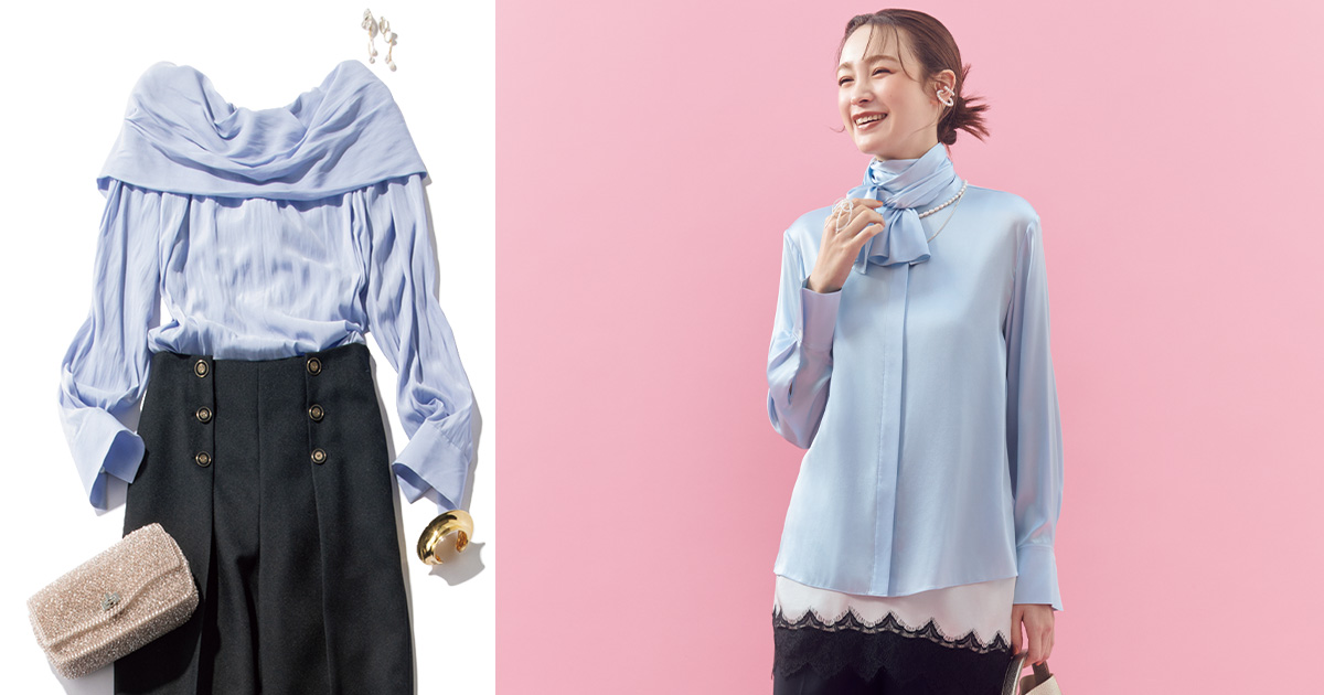 サックスブルーのギャザー入りサテンオフショルで抜け感を。ハイウエストのワイドパンツと合わせることでバランスよく、大人の余裕が漂う着こなしに。式場で映える煌びやかなバッグとゴールドバングルでアクセントを効かせて。ブラウス¥25,300(MIESROHE/MIESROHE ルミネ新宿1店)パンツ¥35,200(ANAYI)バッグ¥79,200(アンテプリマ/ワイヤーバッグ/アンテプリマジャパン)パンプス¥64,900(ネブローニ)イヤリング¥8,580(イットアトリエ)バングル¥84,700(ミショー/アルアバイル)