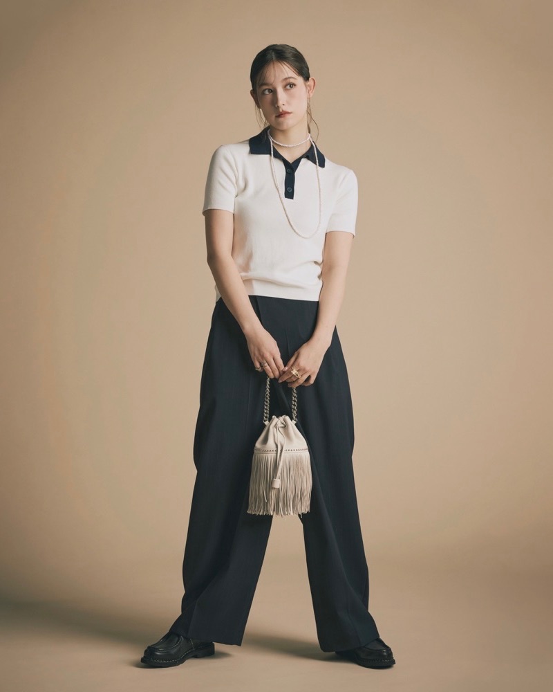 ニットポロ¥2,990(ユニクロ)パンツ¥75,900(アンスクリア/アマン)ネックレス¥35,200〈Pearl for life〉[左人差し指]リング¥52,800〈MASTANI〉リング[左中指]¥3,900ダブルリング[右薬指&小指]¥3,900〈ともにsoie〉(すべてロードス)バッグ¥165,000(J&M デヴィッドソン/J&M デヴィッドソン カスタマーセンター)ローファー¥94,600(パラブーツ/パラブーツ青山店)