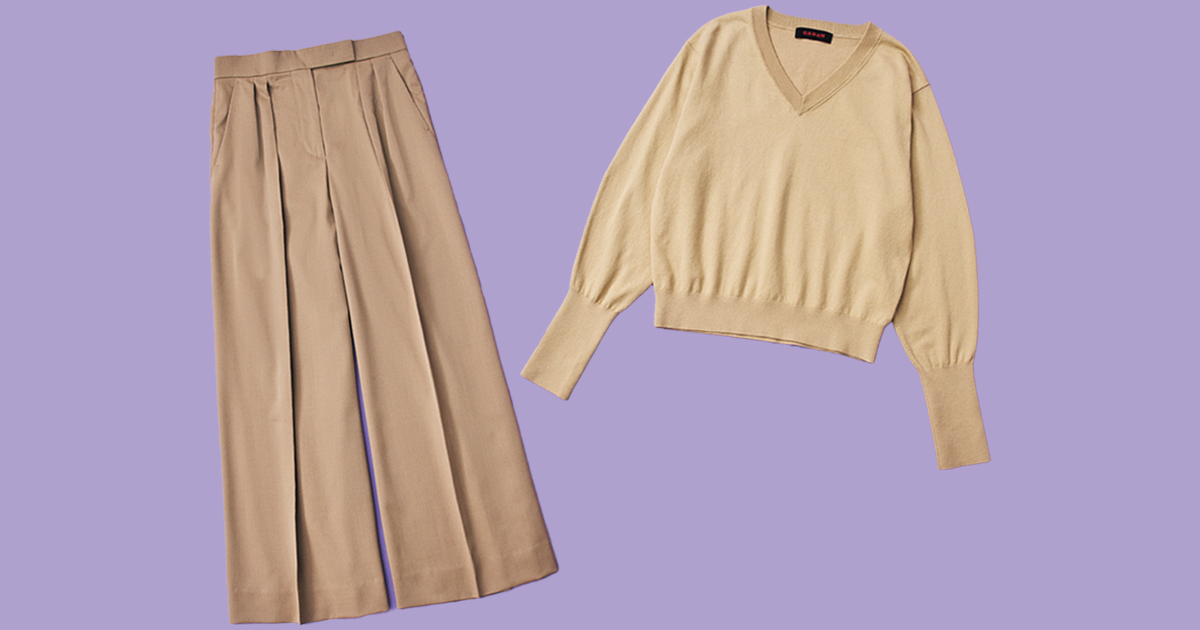 大好きでいくつも持っているCABaNのニット。新しく購入したこちらはVが深すぎず、重ね着しやすいのがポイント。この春気分のベージュを選びました。カシミア混で着心地も柔らかく気に入っています。
