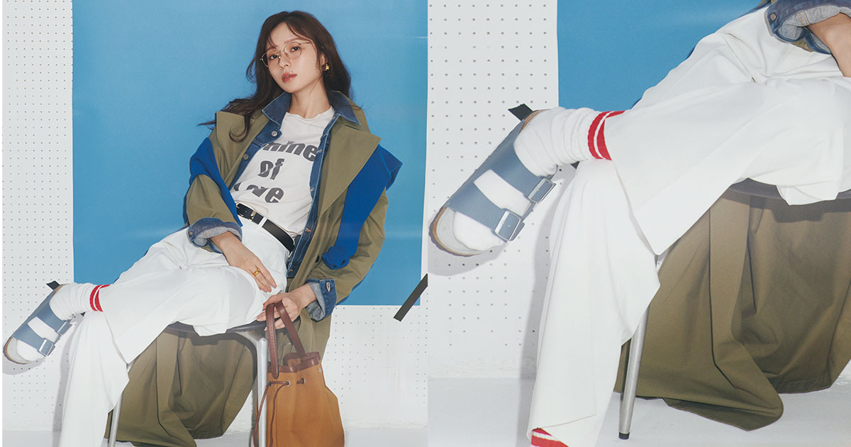 タックワイドパンツ¥3,990(UNIQLO)トレンチコート¥37,400(ジャスグリッティー プレスルーム)デニムジャケット¥46,200(ギャルリー・ヴィー╱ギャルリー・ヴィー 丸の内店)肩にかけたカーディガン¥39,600(キャバン╱キャバン 丸の内店)Tシャツ¥8,800(レミ レリーフ╱エリオポール代官山)ベルト¥19,800(レフィエ╱フラッパーズ)ソックス¥1,474(ユナイテッドアスレ╱キャブ)眼鏡¥47,300(アイヴァン╱アイヴァン 東京ギャラリー)ピアス¥8,690〈ピルグリム〉リング[2本セット]¥39,160〈ソコ〉(ともにZUTTOHOLIC)サンダル¥15,400(ビルケンシュトック╱ビルケンシュトック・ジャパン カスタマーサービス)バッグ¥27,500(トゥティエ)