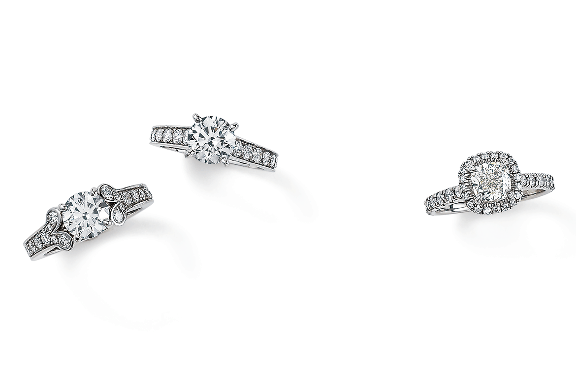 やさしい曲線やパヴェダイヤの繊細さなど、女性の理想を形にしたリングたち。リング右から モデルと同じ リング「ソリテール 1895」〈Pt×Dセンター1.26ct〉¥3,239,800[〈Pt×Dセンター0.30ct〉¥569,800~]リング「バレリーナ」〈Pt×Dセンター1.15ct〉¥2,724,800[〈Pt×Dセンター0.50ct~〉¥1,009,900~](すべてカルティエ/カルティエ カスタマー サービスセンター)