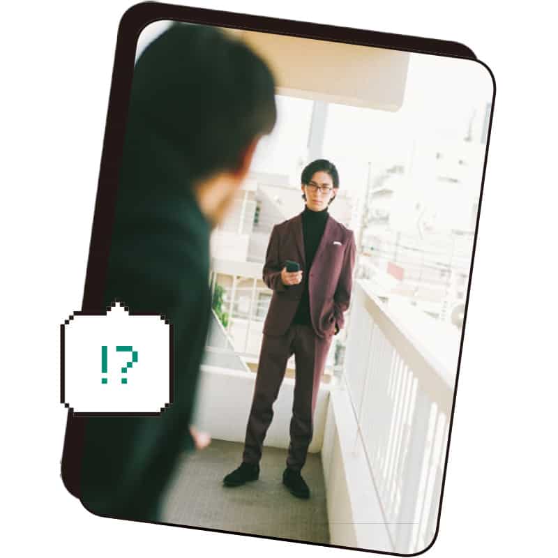 [キョウ] ジャケット¥42,000パンツ¥22,000(ともにムッシュ ニコル エクストラ/ニコル)ニット¥21,000(ダブルスタンダードクロージング ヒム/フィルム)シューズ¥9,800(ステファノロッシ/ABC-MART)バングル¥120,000リング¥75,000(IVXLCDM/IVXLCDM 六本木ヒルズ)メガネ¥43,000(アイヴァン/アイヴァン PR)ベルト、チーフ/ともにスタイリスト私物