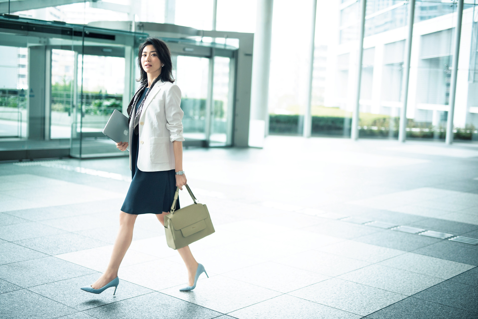 HAIR:ダウンヘアはわけ目をざっくりと立ち上げるように作ることで、かき上げヘアに。 通勤スタイルにヌケ感と華やぎが出ます。
