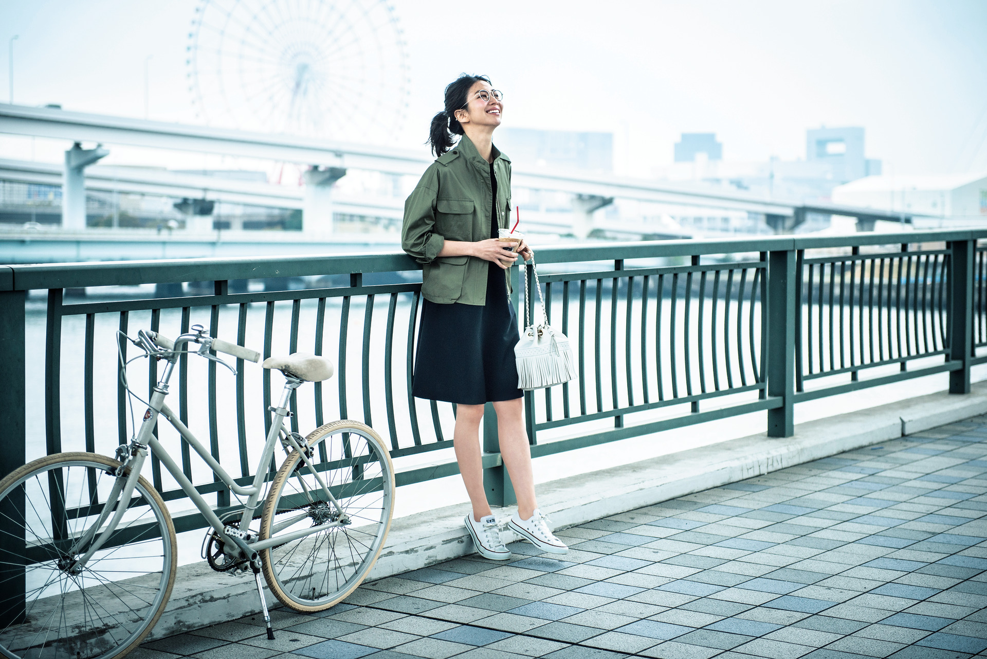 ワークジャケットでカッコよさを足せば甘めのワンピ-スもちょうど良く。メガネ¥40,000(オリバーピープルズ/オリバーピープルズ 東京ギャラリー)