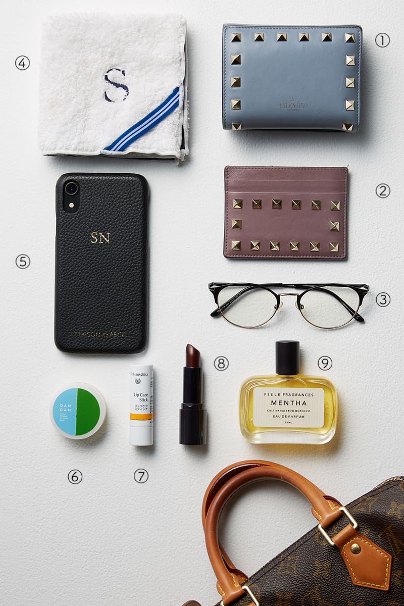 ①②スタッズ付きが大好きなヴァレンティノのお財布と名刺入れ。好きなカラーが登場したタイミングでそれぞれ購入③メガネはいつもバッグにインしています④Mr&Mrs chiefのイニシャルハンカチ⑤iPhoneケースはメゾンドサブレのものでイニシャル入りのシンプルな黒に⑥DAMADAMのリップバームは乾燥がきになる時に顔や爪周り、ヘアのアホ毛を抑えるのに便利でハイライトとしても使えます ⑦Dr.Hauschkaのリップバーム⑧しっかり発色するのに石鹸で落ちる優秀なリップスティックは、Dr.Hauschkaの09番⑨爽やかな香りがお気に入りのFIELE FRAGRANCESのMENTHA