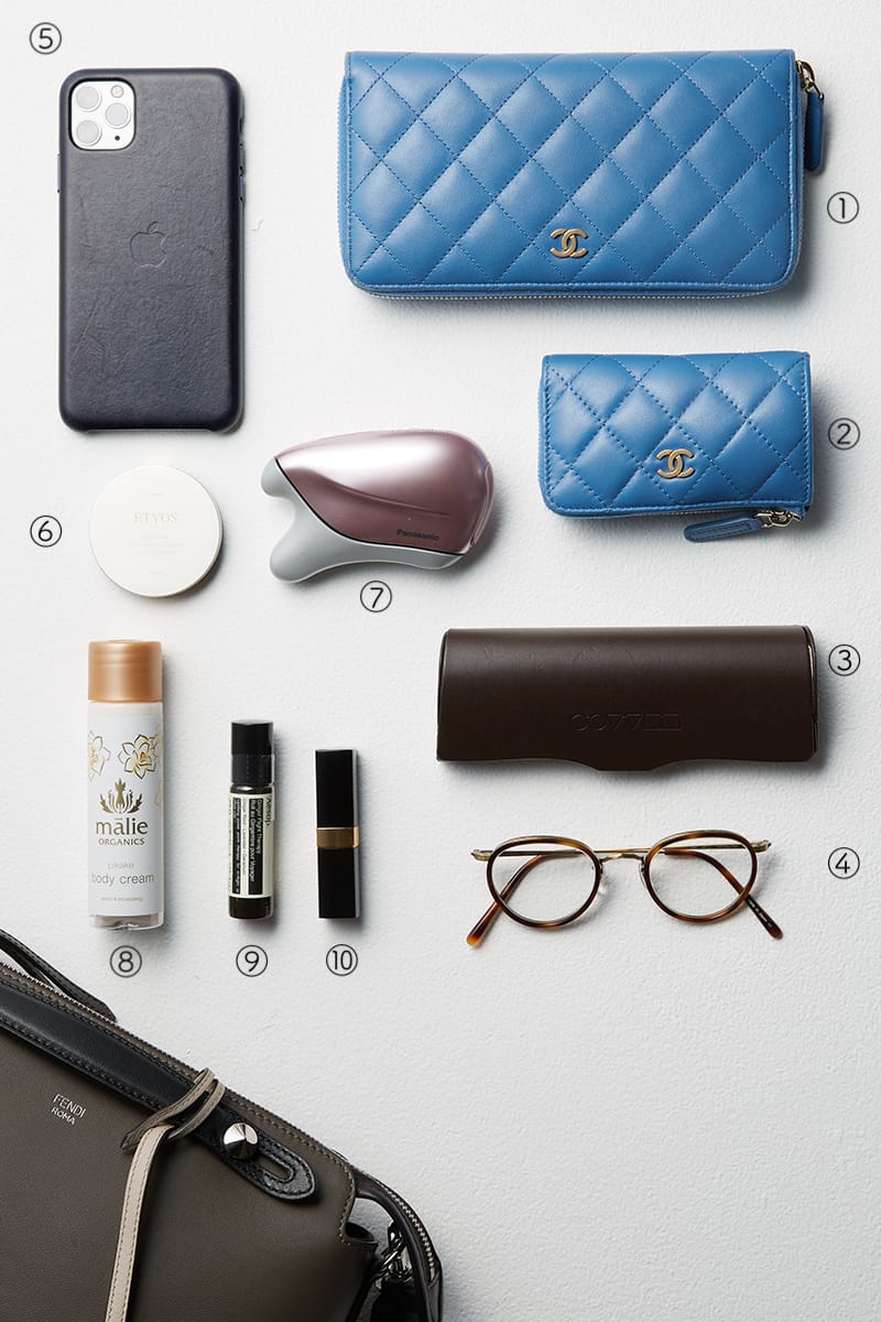 ①クールなブルーに一目惚れしたシャネルのお財布②シャネルのキーケース③④伊達メガネはオリバーピープル⑤iPhone11はカメラが高機能でお気に入り。ケースはあえてメンズライクに⑥ETVOSのハイライトクリーム⑦Panasonicのカッサは撮影の日のマストアイテム⑧乾燥防止にマリエオーガニクスのボディクリーム⑨イソップのスキンオイルは香りが好き!⑩程よい色づきがお気に入りのシャネルのリップクリーム
