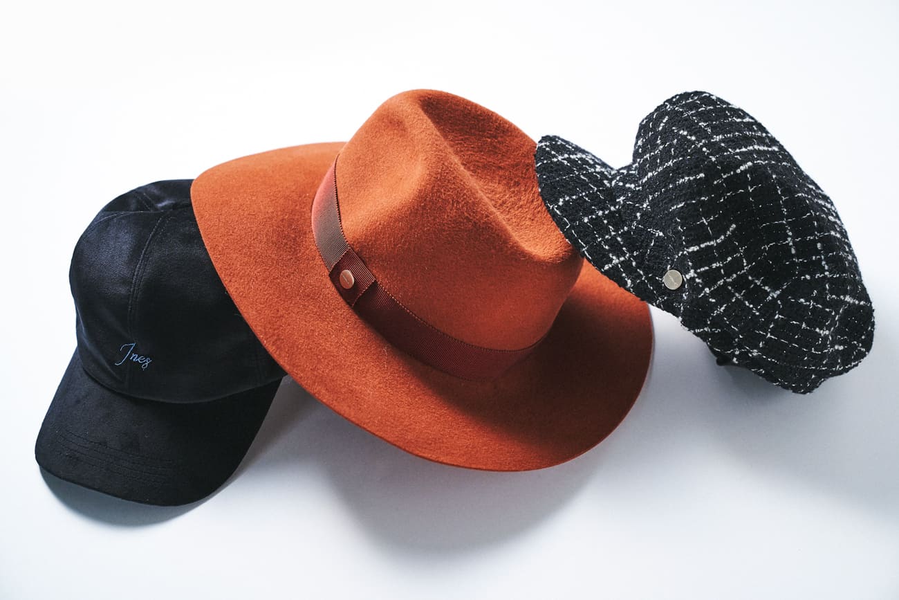 <左>オフの日にかぶることが多いというキャップも素材を変えて取り入れます。キャップ¥3,900(カオリノモリ/カオリノモリ ハラジュク)<中>トレンドの柿色の中折れ帽はコーディネートのアクセントにぴったり。フェルト中折れハット¥28,000 (ともにシャポード オー/シャポード オー 東急プラザ銀座店)<右>いつもはシンプルな黒のキャスケットが定番だけど、この冬はツイード素材にも挑戦。ツイードハンチング帽¥8,900