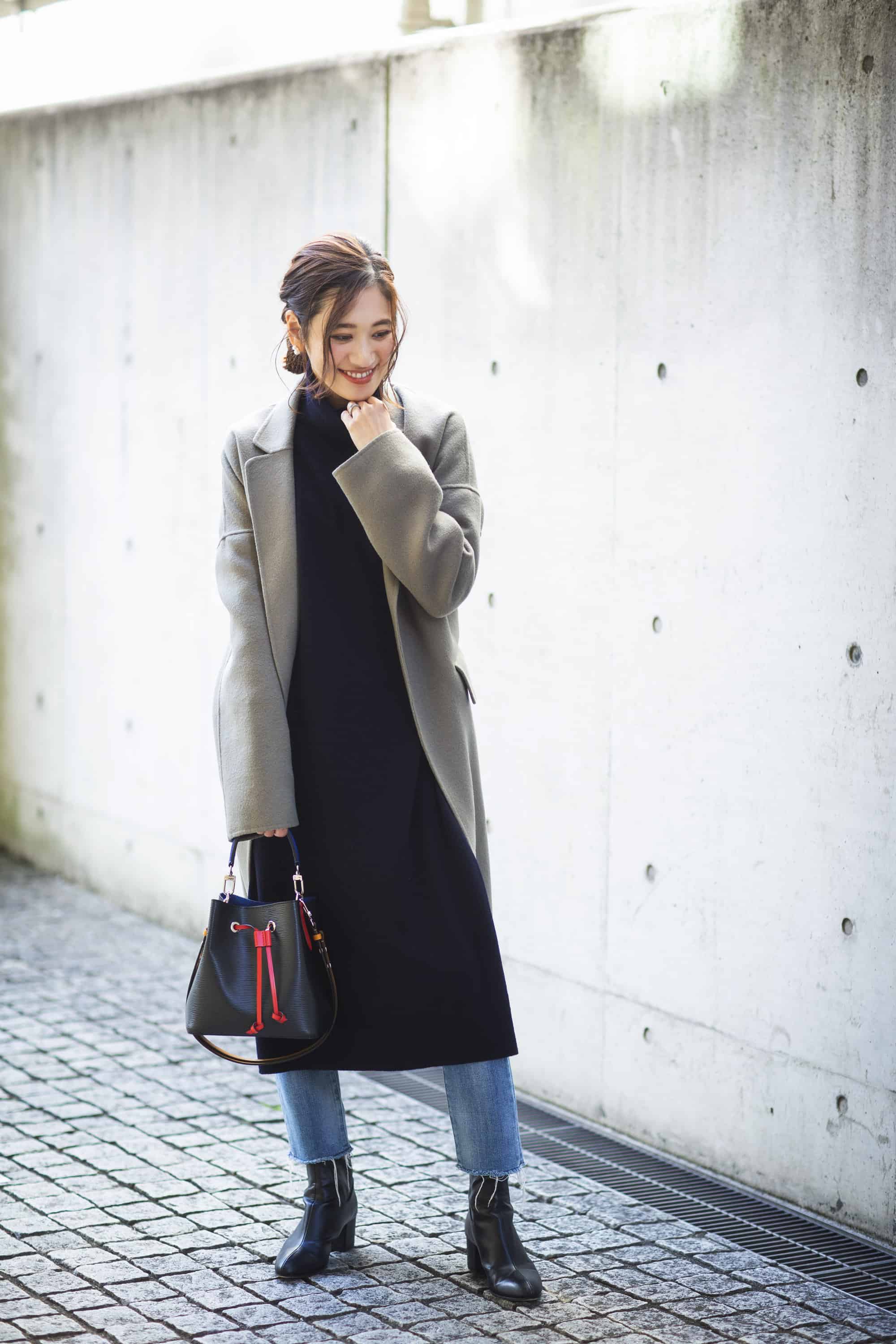 コート:STUNNINGLURE ニットワンピ:Deuxieme Classe デニム:REDCARD バッグ:LouisVuitton ブーツ:ZARA