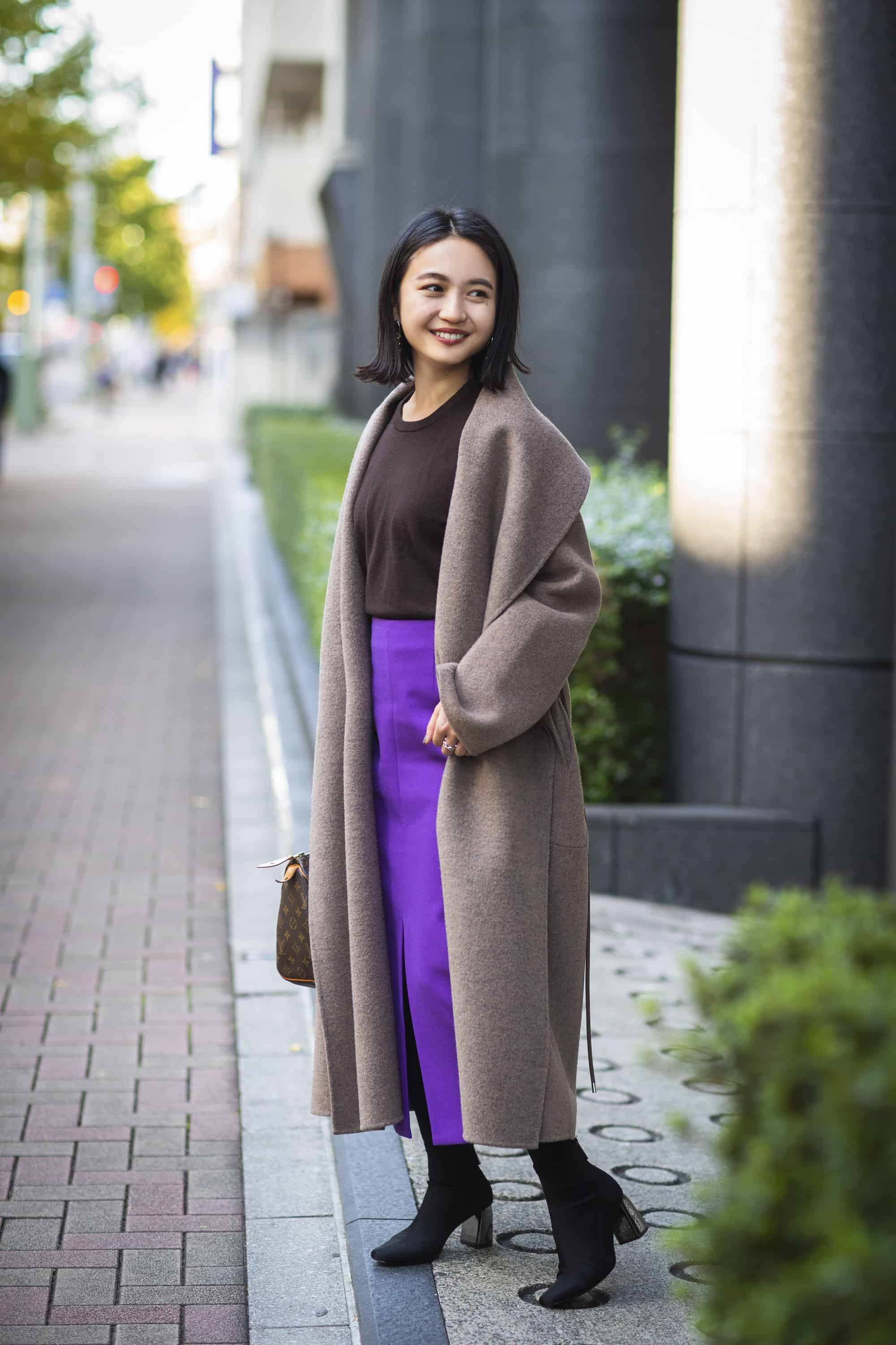 「お店で一目惚れしたガウンコートは約7万円で購入したもので、リラクシーに着られる大きな襟のデザインがポイント。あえてシンプルなタイトスカートとニットでスッキリ見えるようにしつつ、コートはさっと羽織るだけにしました。地味にならないようにパープルカラーをスカートでトレンド感も演出です」(夏目頌子さん フリーデザイナー/IT関連会社勤務・28歳 159cm)