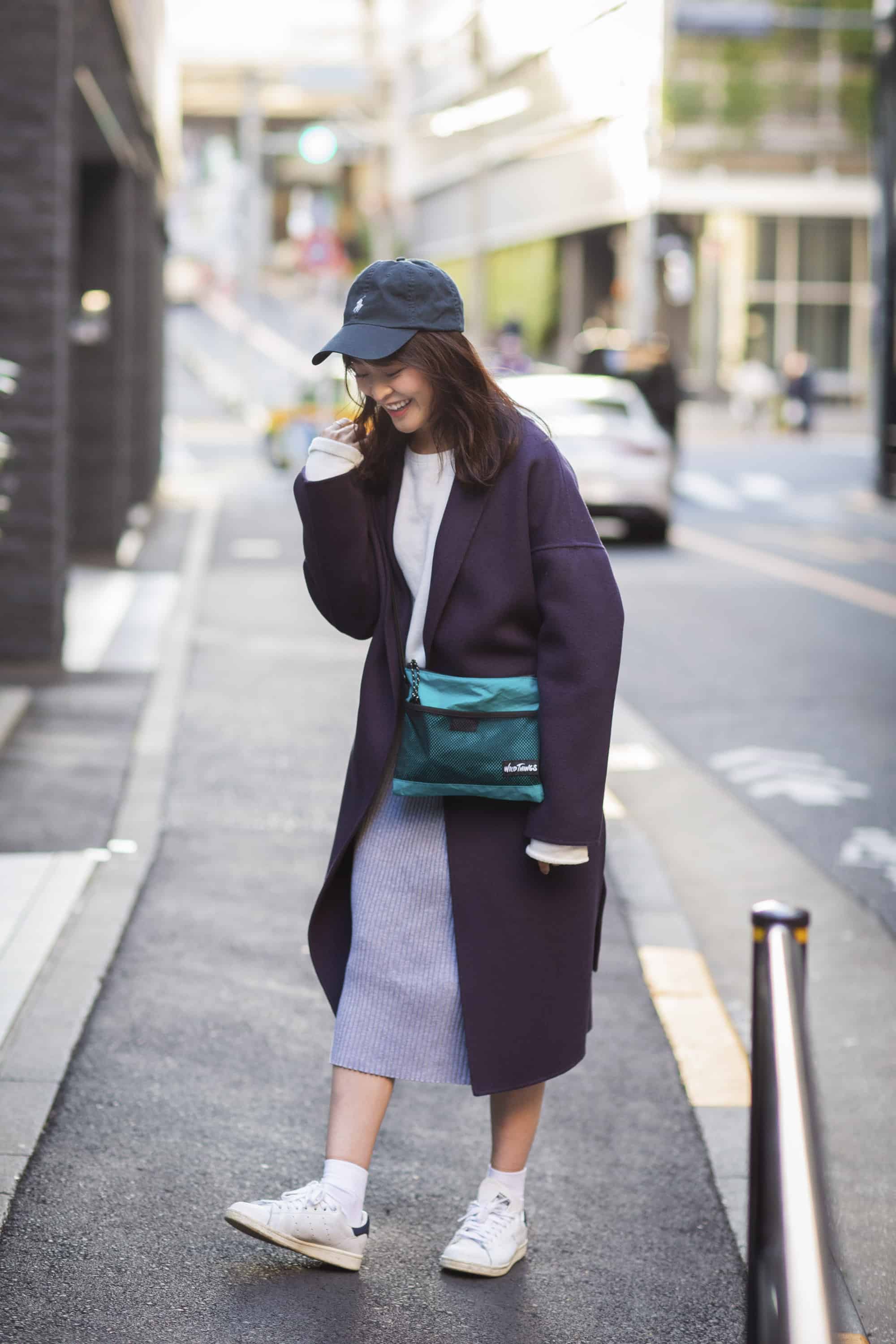 コート:STUNNINGLURE トップス:ESSEN.LAUTREAMONT スカート:Ron Herman キャップ:RALPH LAUREN バッグ:WILD THINGS スニーカー:adidas