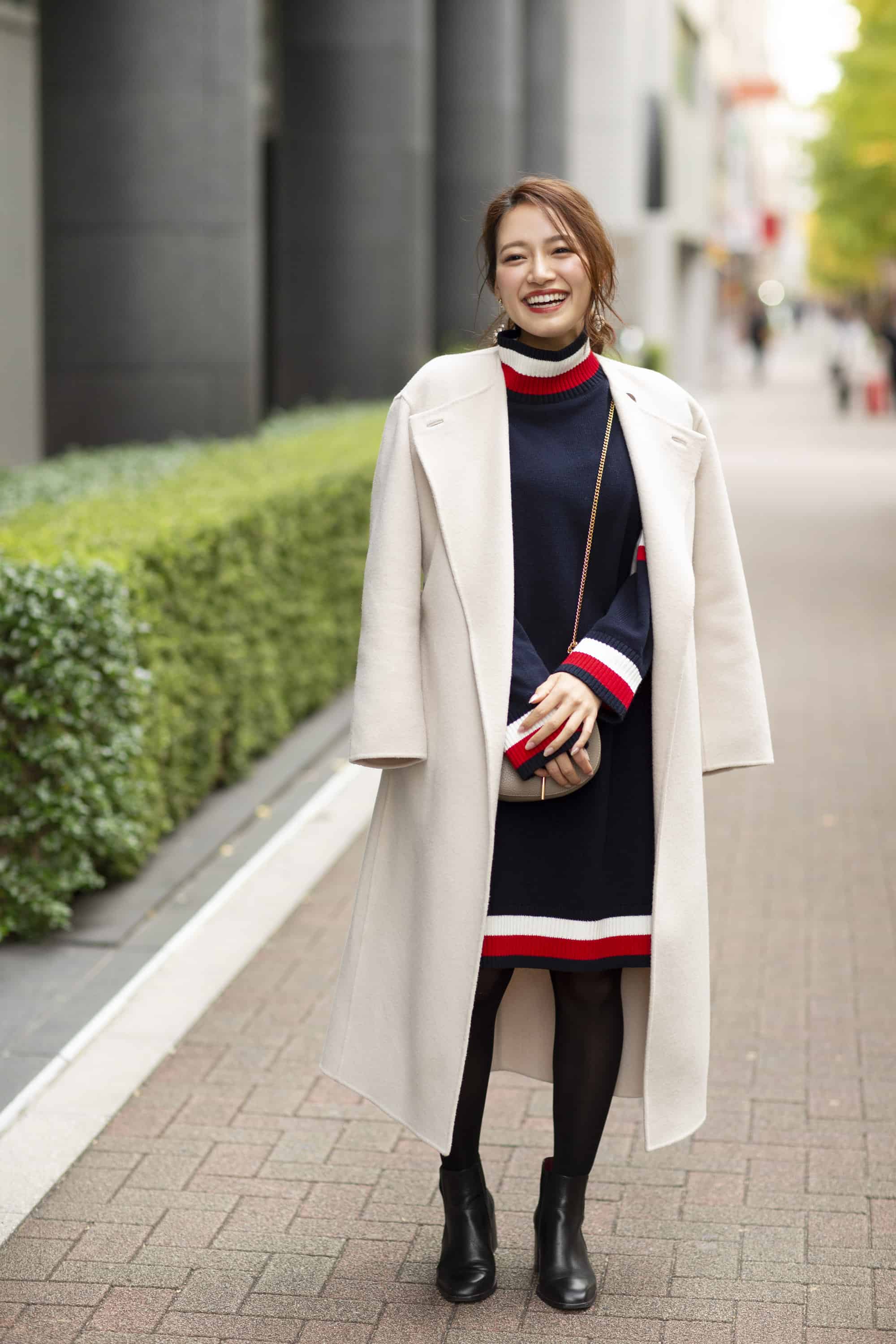 「アラサーになってアウターにこそ上質さを求めるようになりました。特に大好きだけどあざとくなったり、可愛くなりがちな白コートこそ、大人っぽさが欲しいと思っていたところにちょうどよく発見したのがこのリバーコート。生地が薄めで軽い着心地なのに暖かさは抜群だし、上質なウールなので見ためも上品。会社ではコンサバに着ていますが、休日はこんなカジュアルなニットワンピに肩掛けしてしまうのが気分です」(光沢真実さん 外資系IT企業勤務・28歳 156cm)