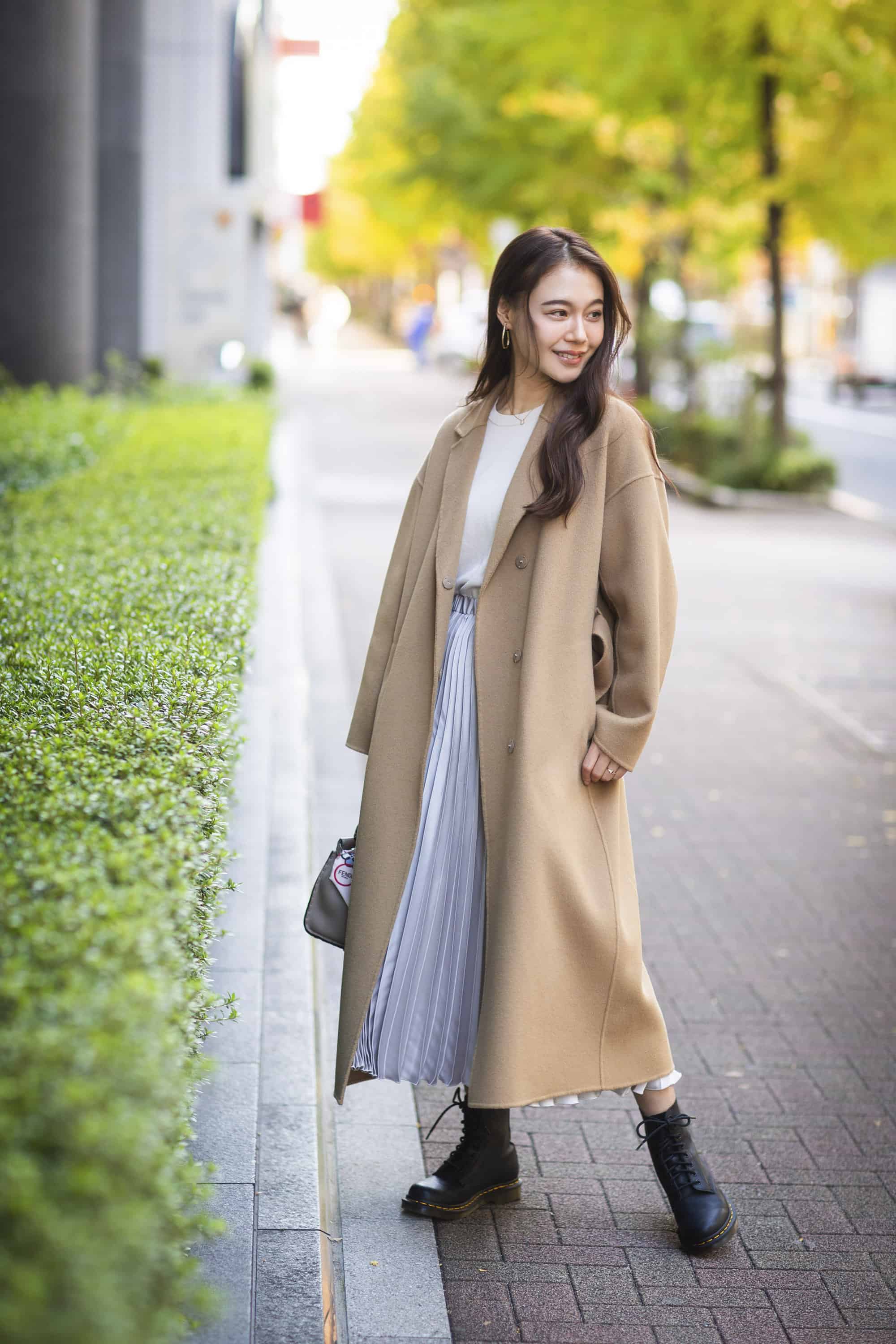 「バサッと羽織れるコクーンシルエットのベージュコートはニットとプリーツスカートでシンプルに合わせつつ、ドクターマーチンのレースアップブーツで足元をハズして意外な感じに。お仕事仕様のきれいめコートがたちまちトレンドコーデっぽくなるし、楽ちんなのにオシャレに見える簡単テクニックです」(稲田梨乃さん 商社勤務・28歳 161cm)