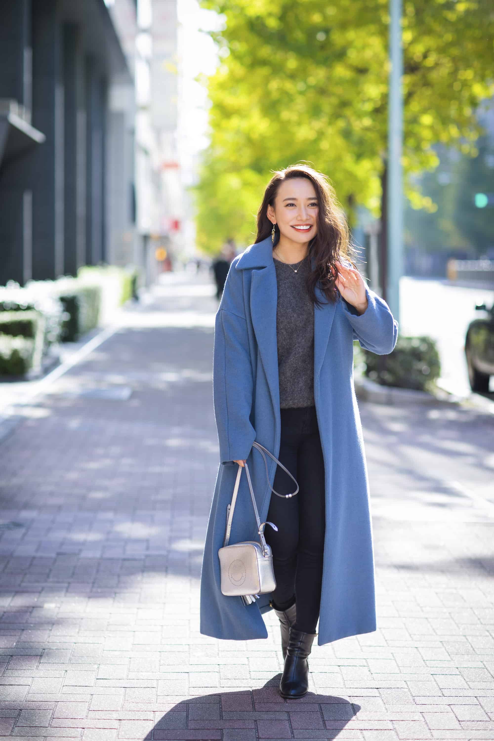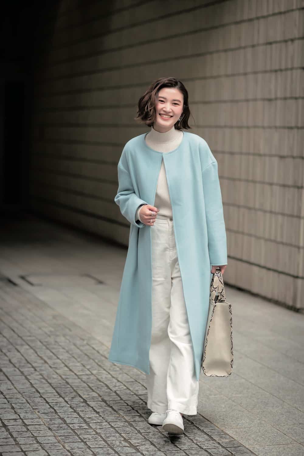 水色コートに白を合わせれば仕事もデートも万能の品の良さ