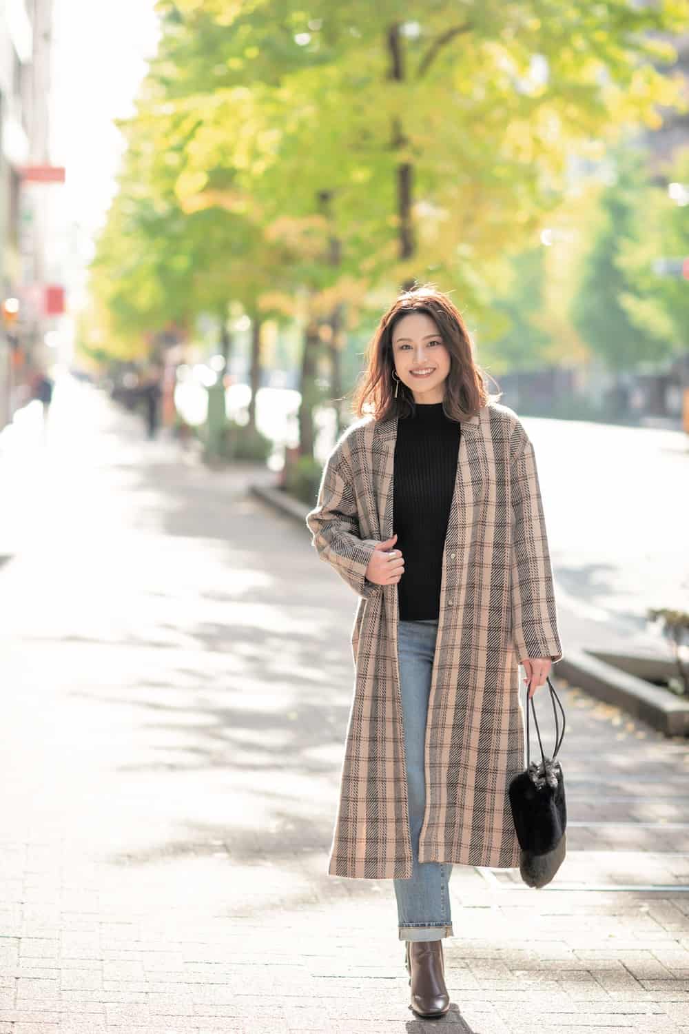 『ちょっと個性的なコートが欲しくてZOZOで探していたところ、このチェック柄コートを発見。茶系のトーンに統一されたチェック柄なのでどんなアイテムにもハマるし、コーディネートがしやすのが特徴。手持ちデニムにシンプルに合わせるだけで、定番のデニムスタイルも見違えます』(井上友美さん 外資系金融勤務・30歳 162cm)