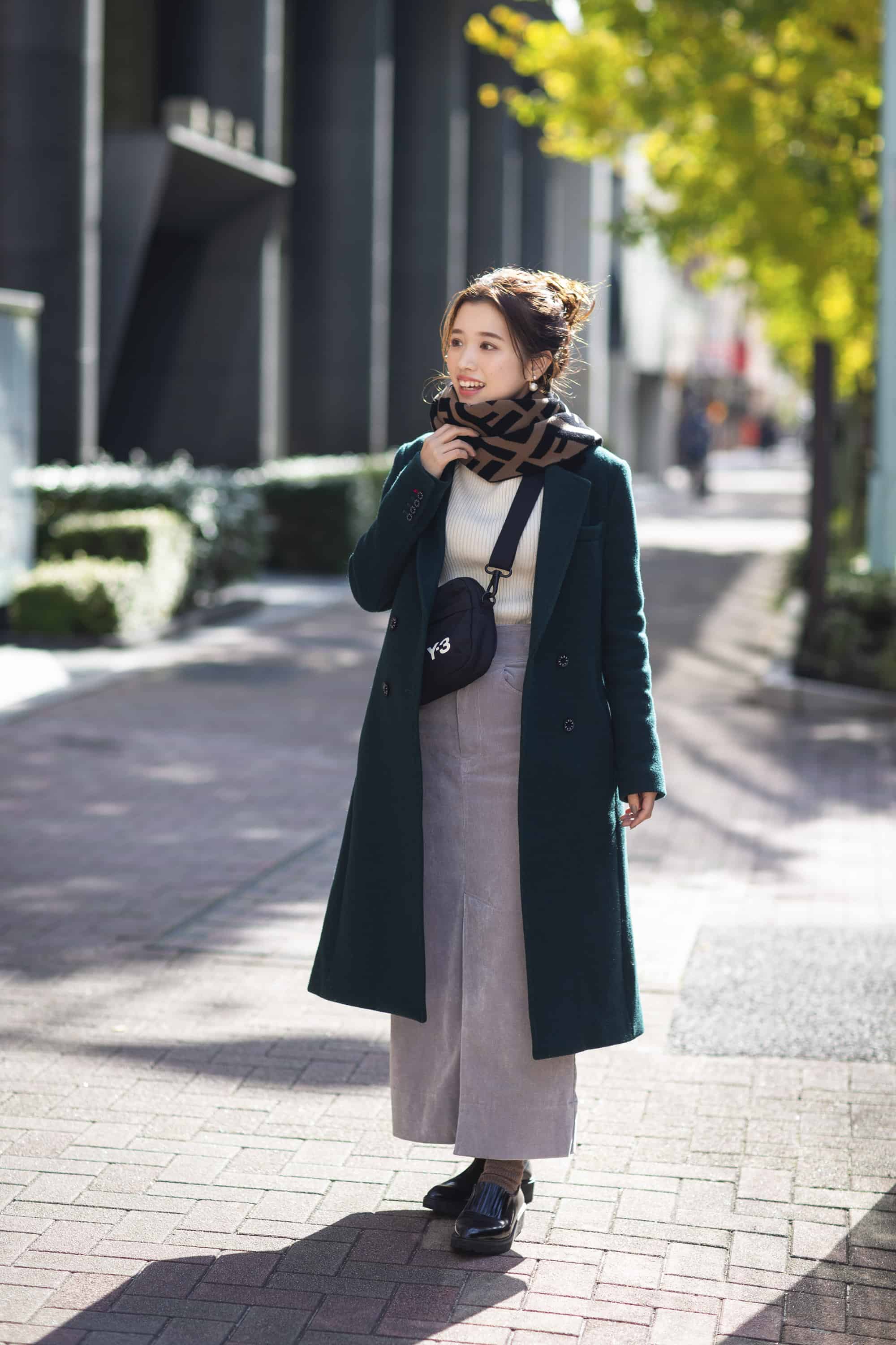 きれいめなコートなので着こなしが物足りなくならないようにFENDIのロゴマフラーや旦那さんとシェアしているY-3のナイロンバッグでちょっぴりストリート感のあるスポーティに仕上げました。足元もローファー×ソックスでこなれさせたのがポイント。真冬はこんな楽チンであったかスタイルにお出かけするのが定番です。(入江史織さん 人材関連会社勤務・30歳 158cm)