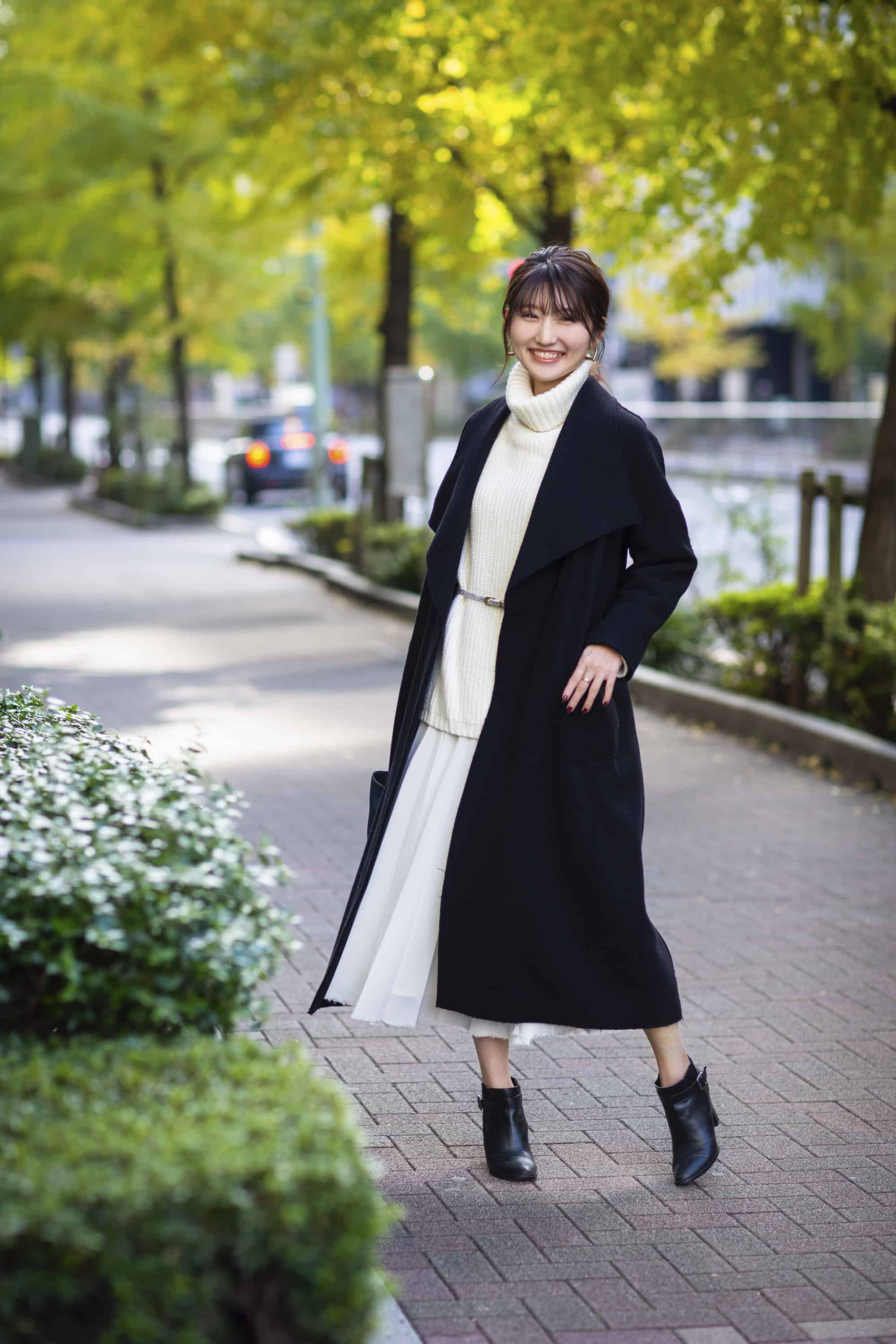 黒のロングコートは真っ白なニット×スカートでエレガントに着こなします