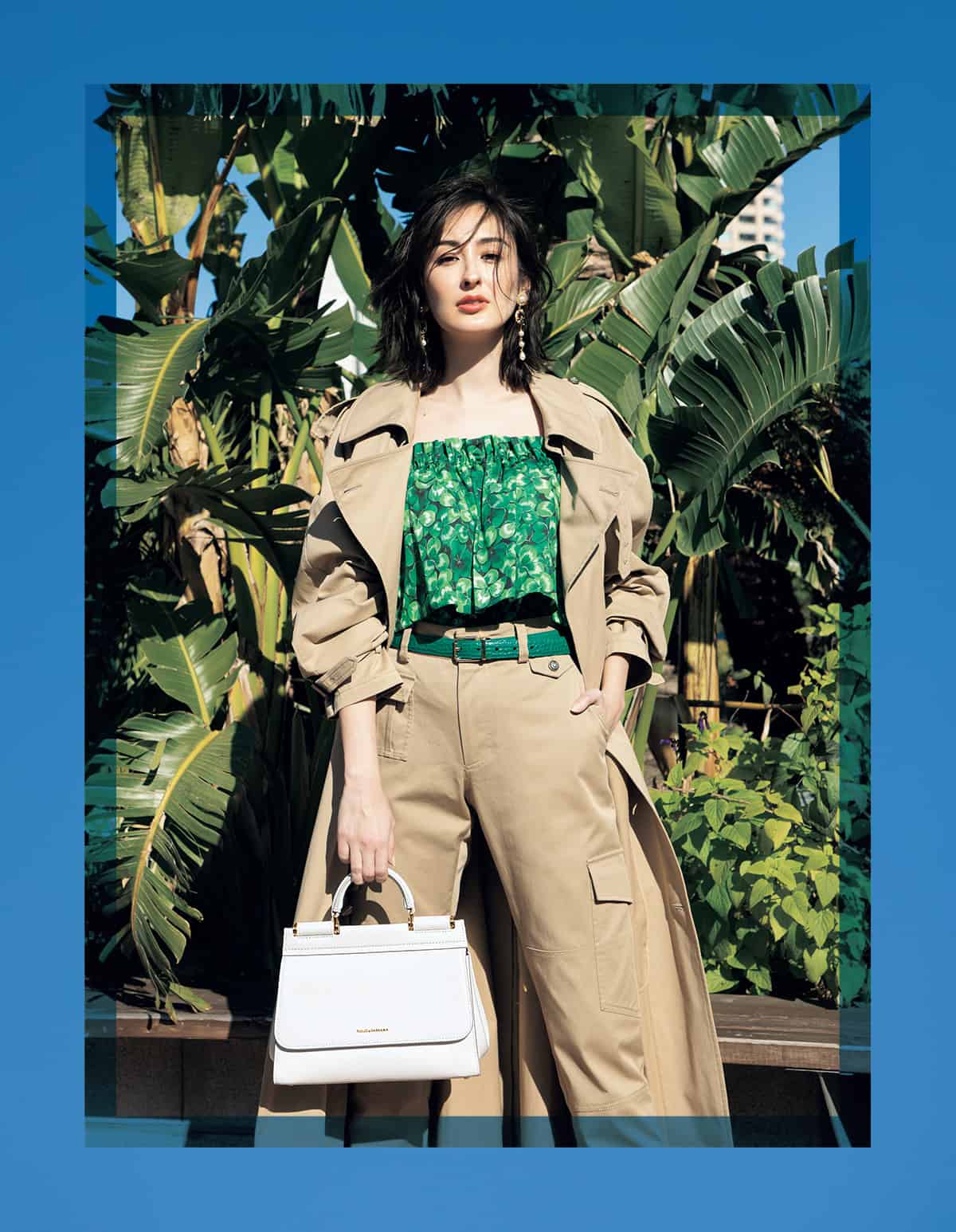 洗練されたトップハンドルのシンプルなデザインはラフに持っても上品さをキープできるのがうれしい。ストラップを付ければ斜めがけも。 バッグ「シシリー ソフト(スモール)」[ショルダーストラップ付き]〈W27×H20.5×D10.5cm〉¥219,000トレンチコート¥360,000トップス¥87,000(阪急うめだ本店にて先行発売予定)パンツ¥111,000ベルト¥114,000(以上5点予定価格)イヤリング¥63,000(すべてドルチェ&ガッバーナ/ドルチェ&ガッバーナ ジャパン)
